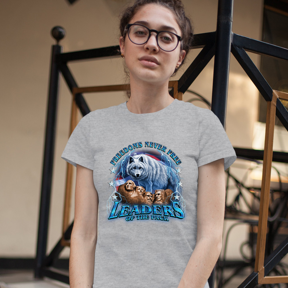 A patriotic print featuring the Mount Rushmore. There is a huge white wolf with the American flag in the background and lightning strikes all over the place. The print says: "Freedom's Never Free, Leaders of the Pack". Great choice to wear on Independence