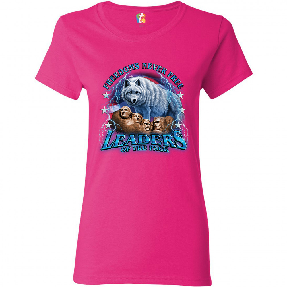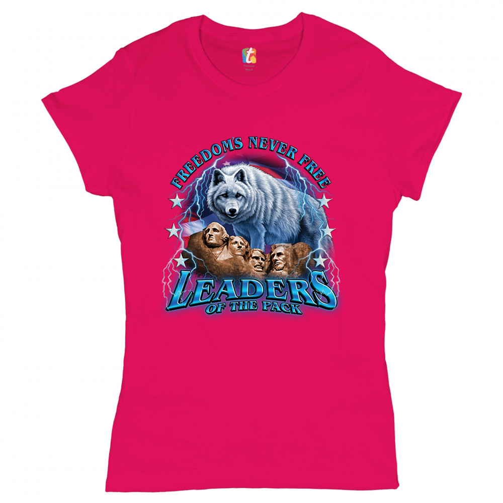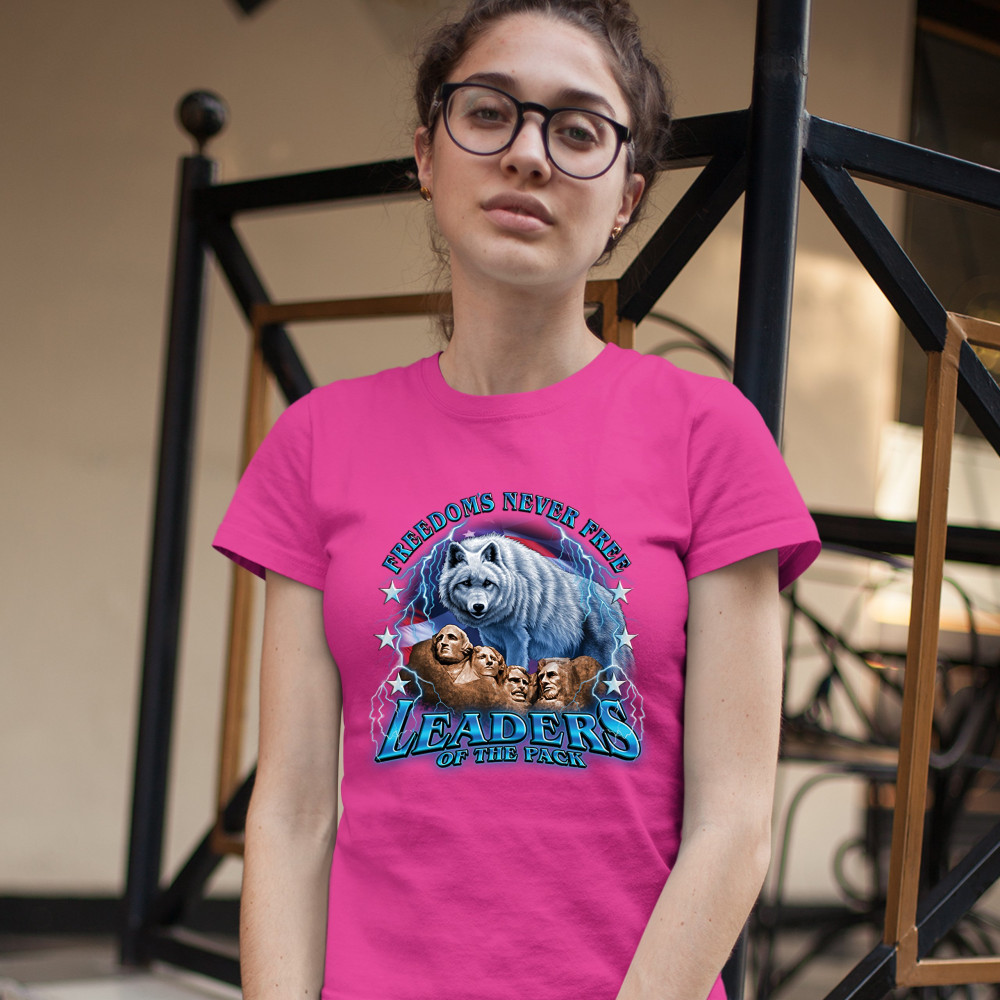 A patriotic print featuring the Mount Rushmore. There is a huge white wolf with the American flag in the background and lightning strikes all over the place. The print says: "Freedom's Never Free, Leaders of the Pack". Great choice to wear on Independence