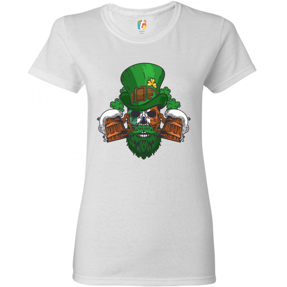 A print featuring a skull with green beard and Irish flag face. The skull is wearing a leprechaun hat. There are two beer mugs and numerous shamrocks around the skull. A great choice to wear on March 17 to celebrate the St. Patrick's Day and showcase your