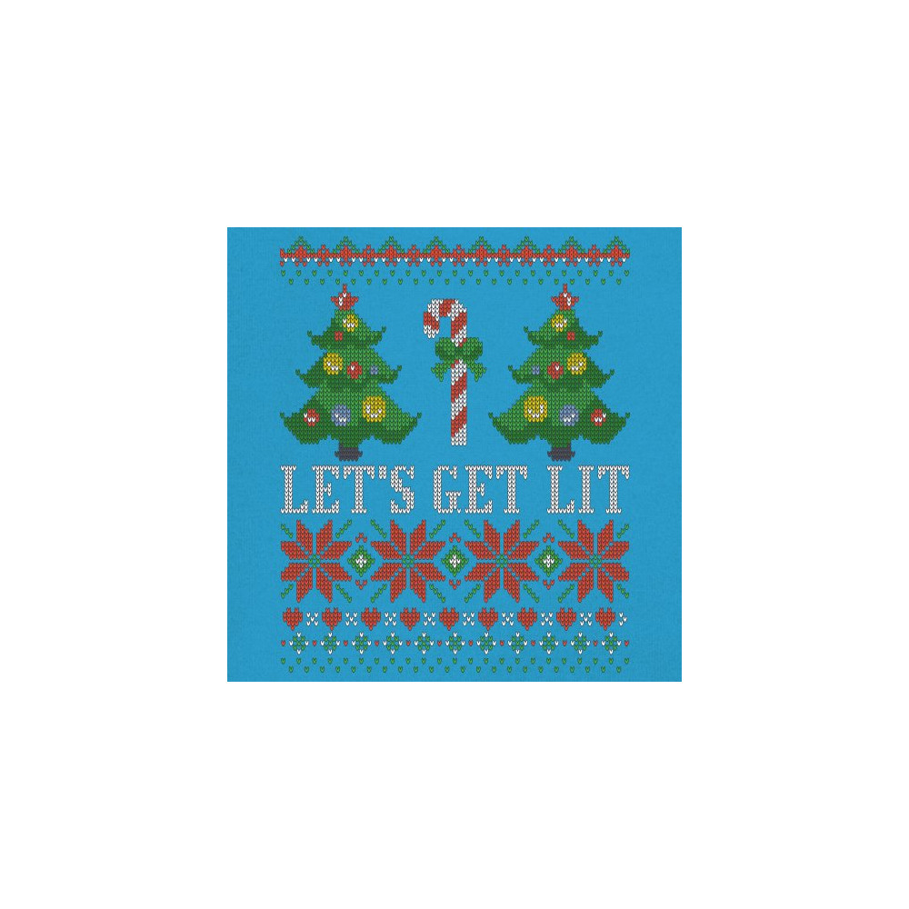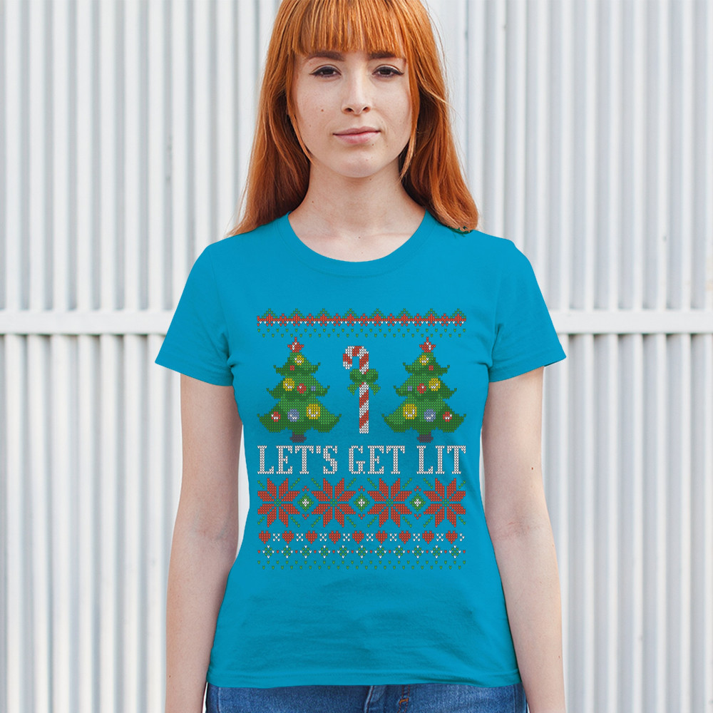 A print saying: "Let's Get Lit" and depicting two Christmas trees and a candy cane between them. The print is decorated as an ugly sweater. A great choice for a Christmas eve celebration.