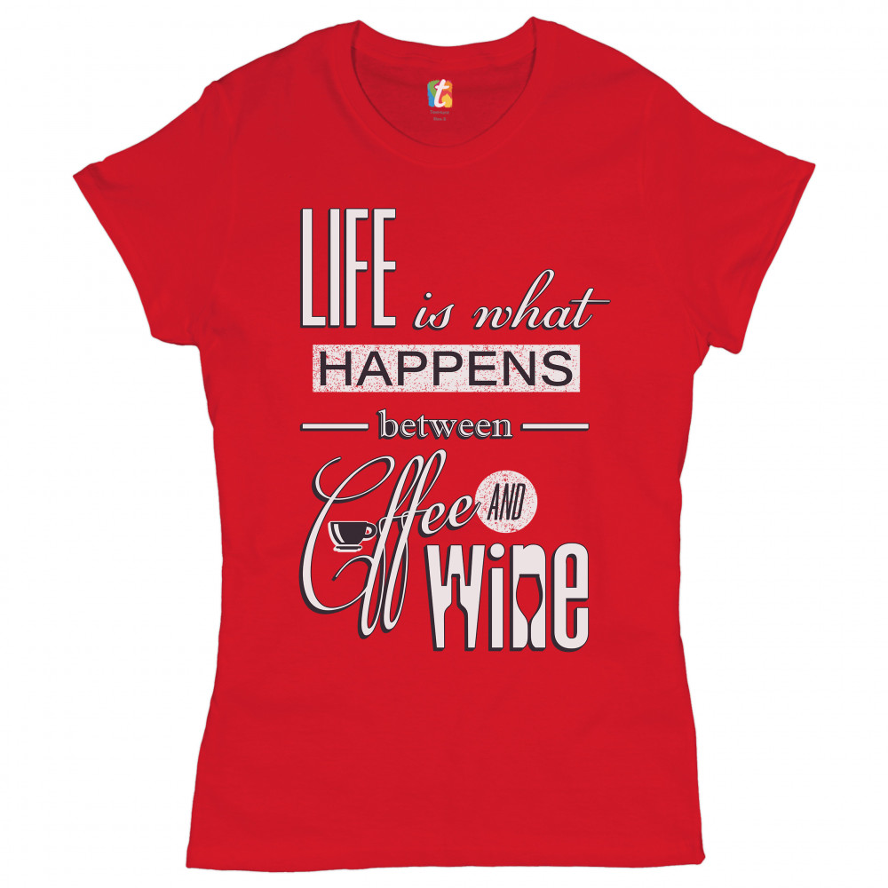 A print saying "Life is what happens between coffee and wine". Inside the letter "C" in "coffee" there is a cup and inside the word "wine" there are silhouettes of a bottle and a glass. Wear it to spread positive vibes and show your passion for the two best drinks in the universe!