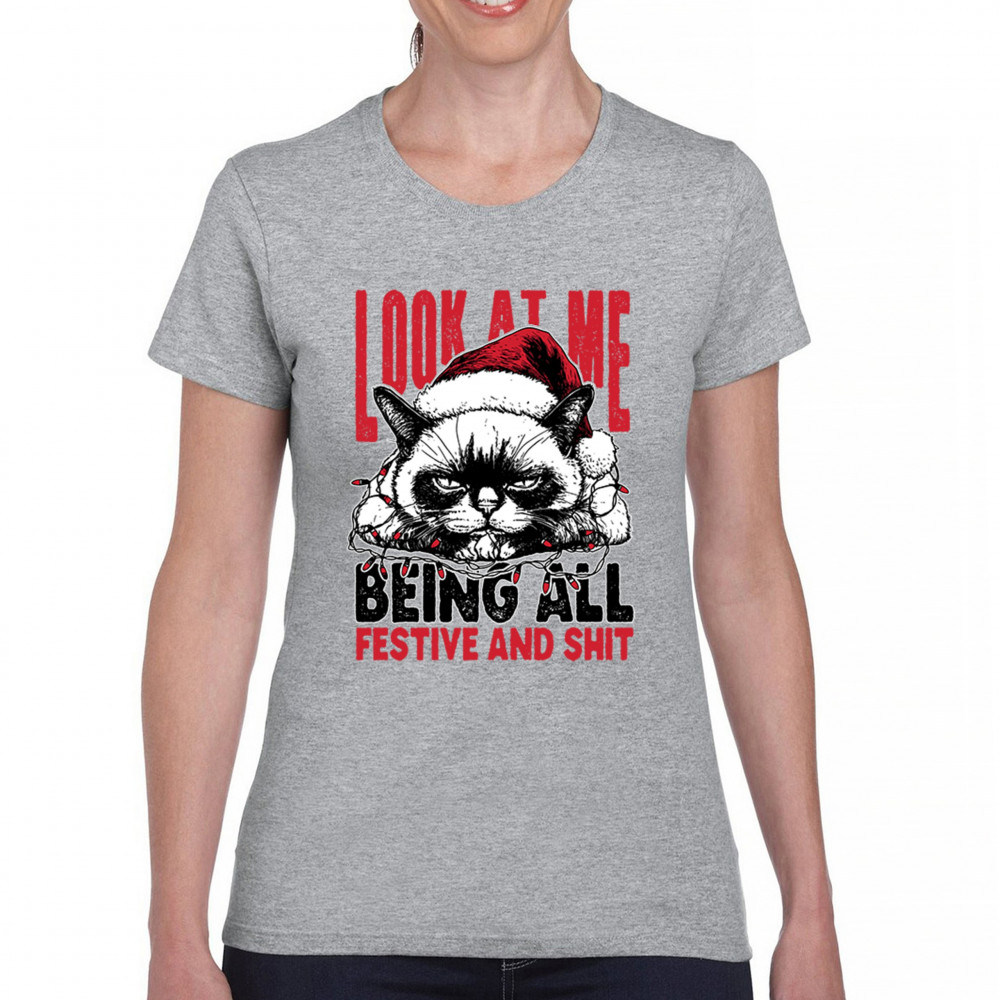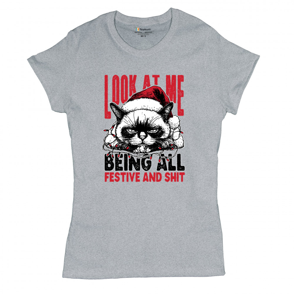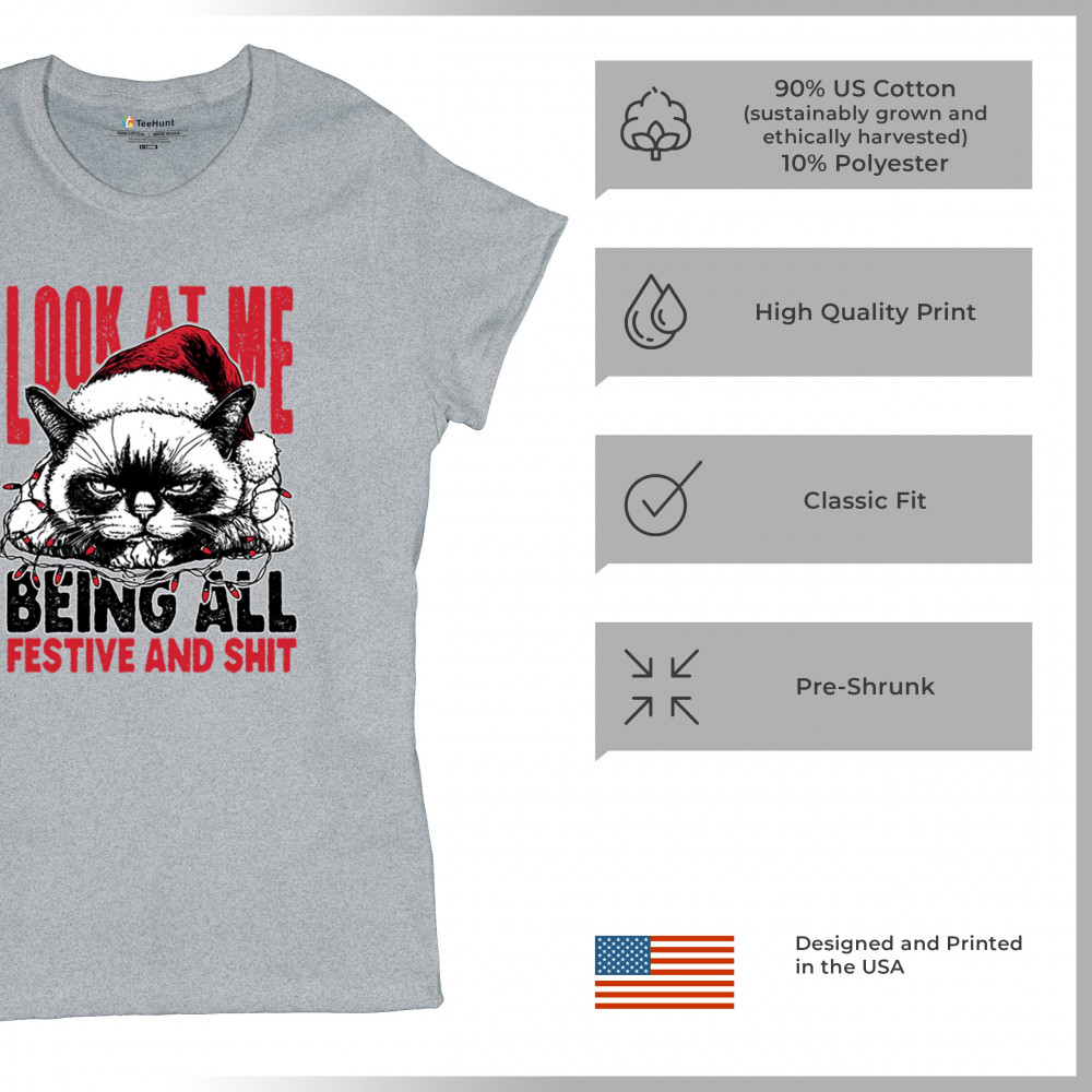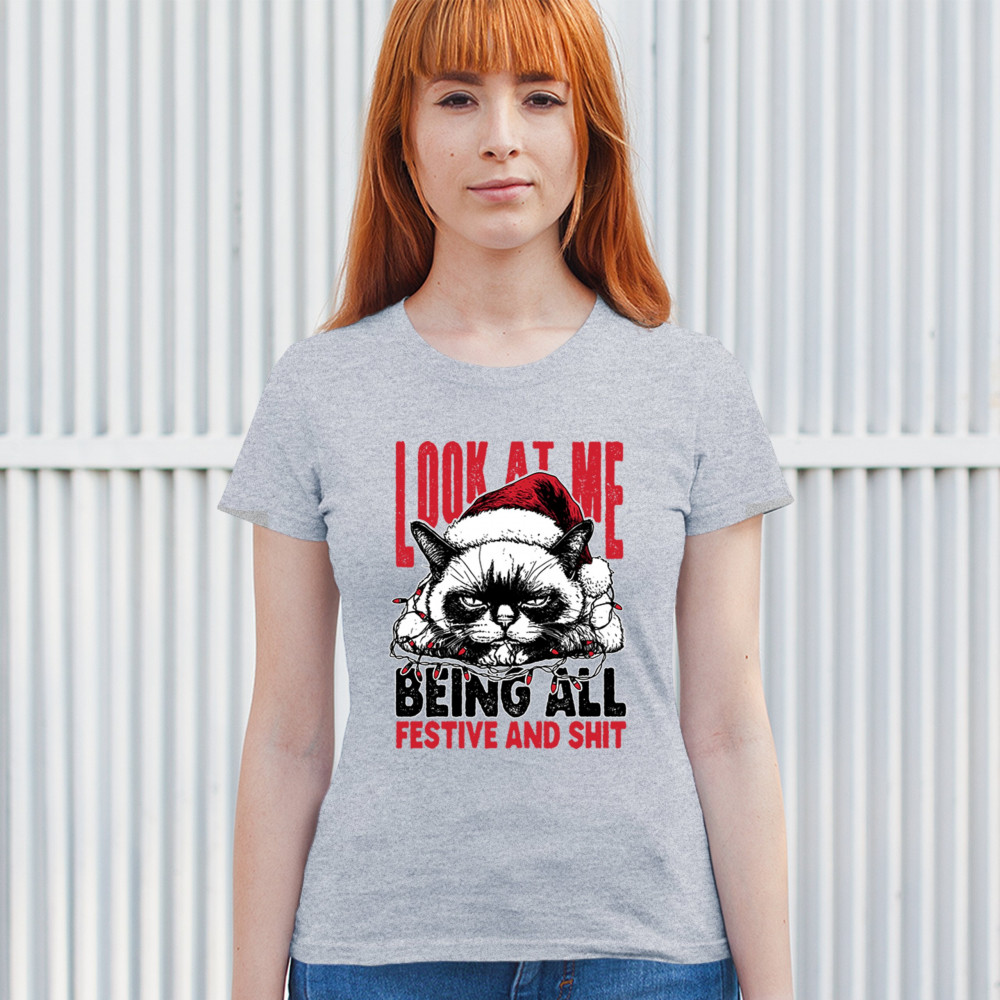 Grumpy Cat Christmas design with Santa hat, Christmas tree humor, Let It Snow vibes, Jingle Bells style, and sarcastic Merry Xmas spirit.