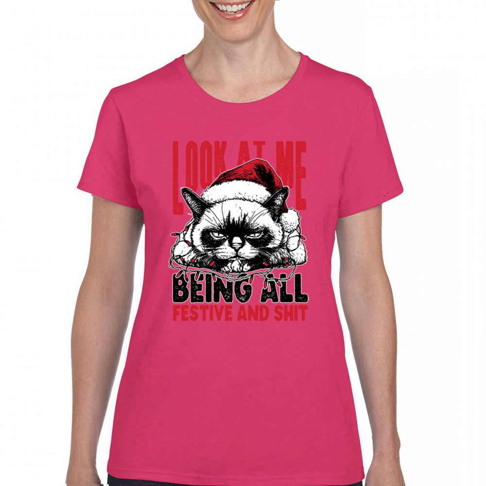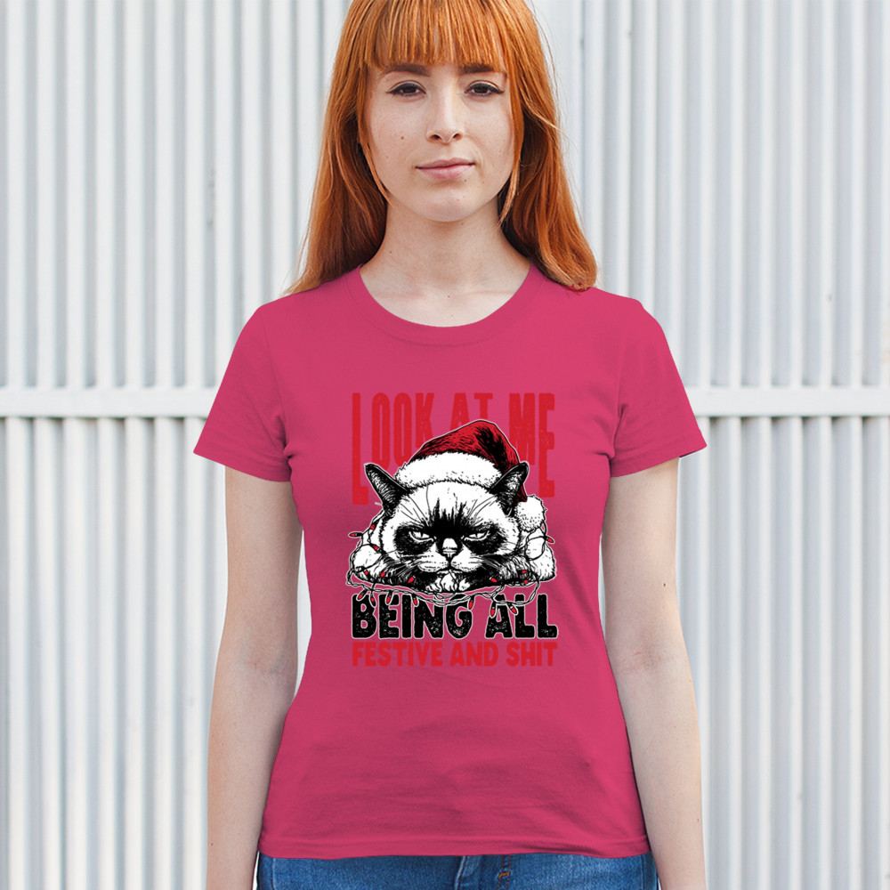 Grumpy Cat Christmas design with Santa hat, Christmas tree humor, Let It Snow vibes, Jingle Bells style, and sarcastic Merry Xmas spirit.
