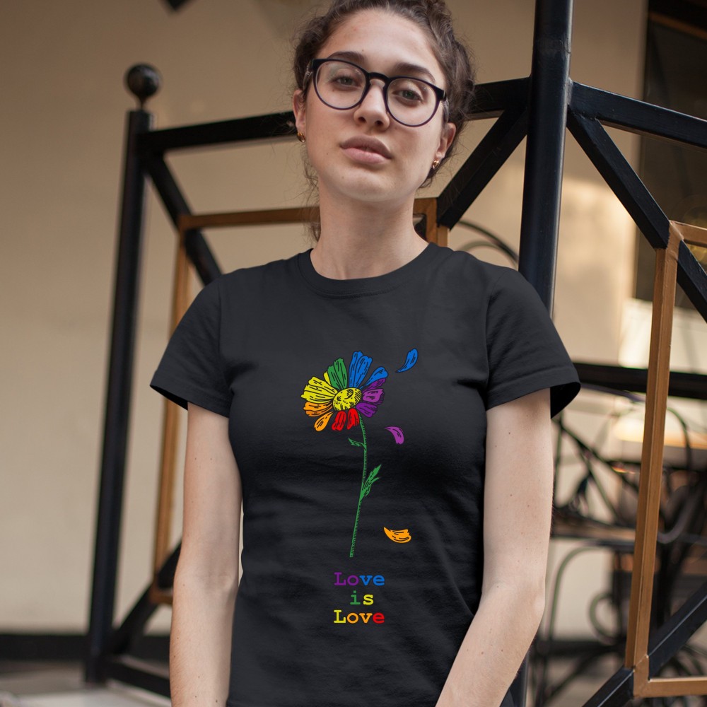 A print featuring a flower with leaves, painted in rainbow colors, falling off it. Below it it says: "Love Is Love". Great choice to wear as a proud queer person.