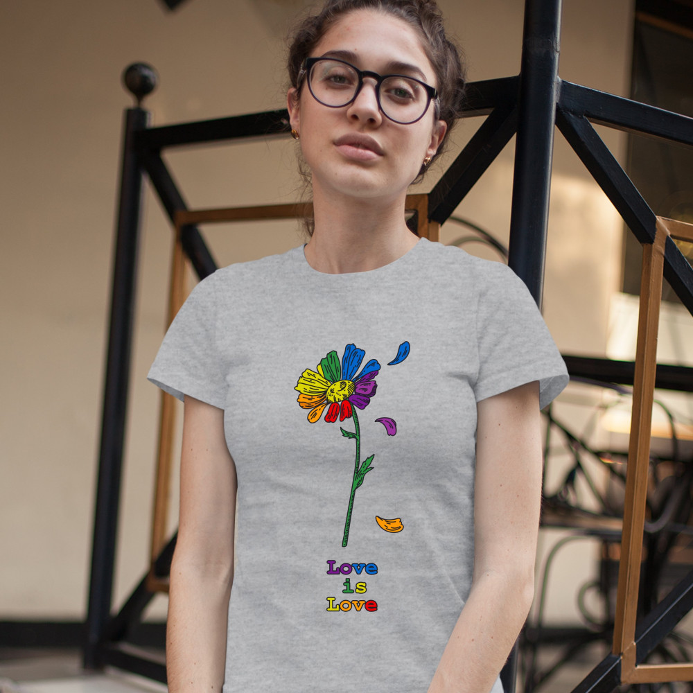A print featuring a flower with leaves, painted in rainbow colors, falling off it. Below it it says: "Love Is Love". Great choice to wear as a proud queer person.