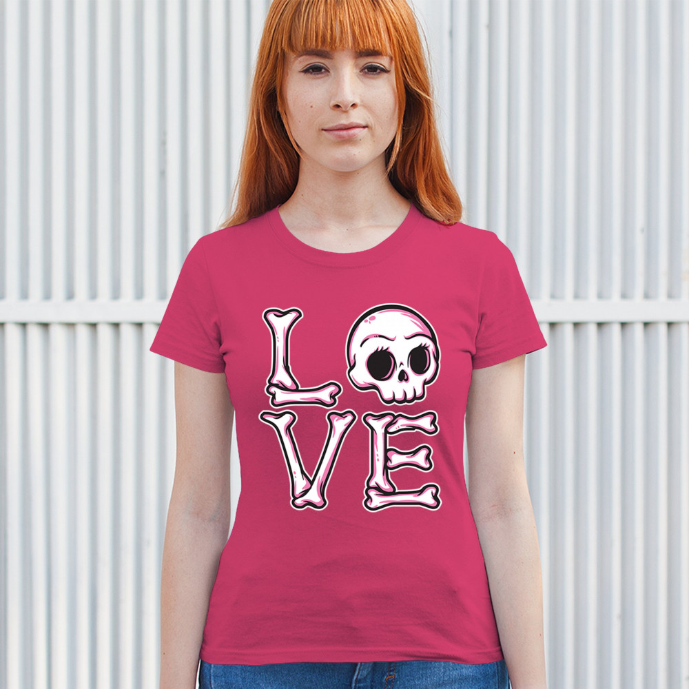 Celebrate spooky romance with this playful “LOVE†design made from pink bones and a cartoon skull. Perfect for goth girls, punk couples, and alt fashion fans, this design mixes Halloween style with sweet sentiment. Great for festivals, romantic gifts, or edgy everyday wear that breaks the rules of traditional love.