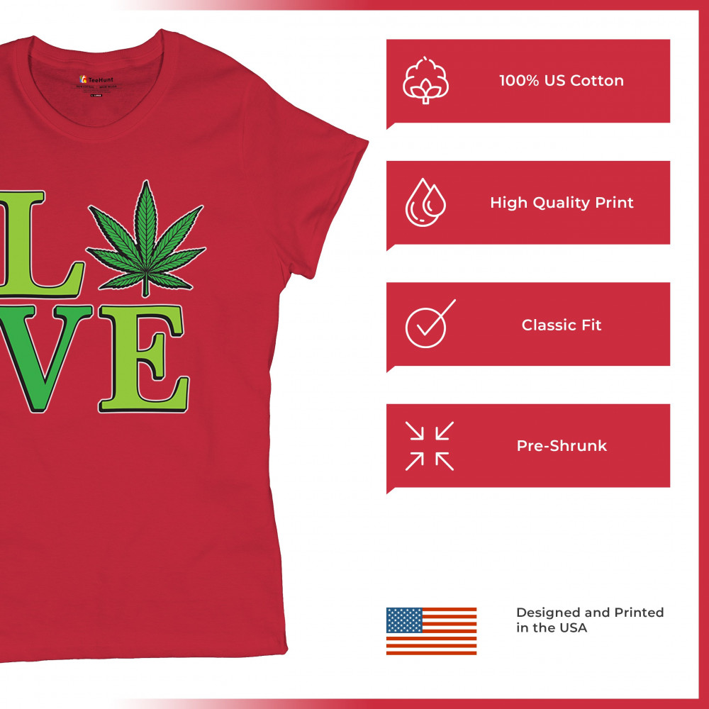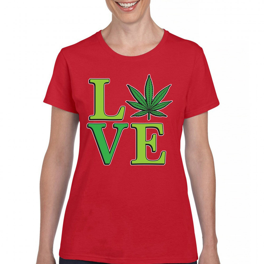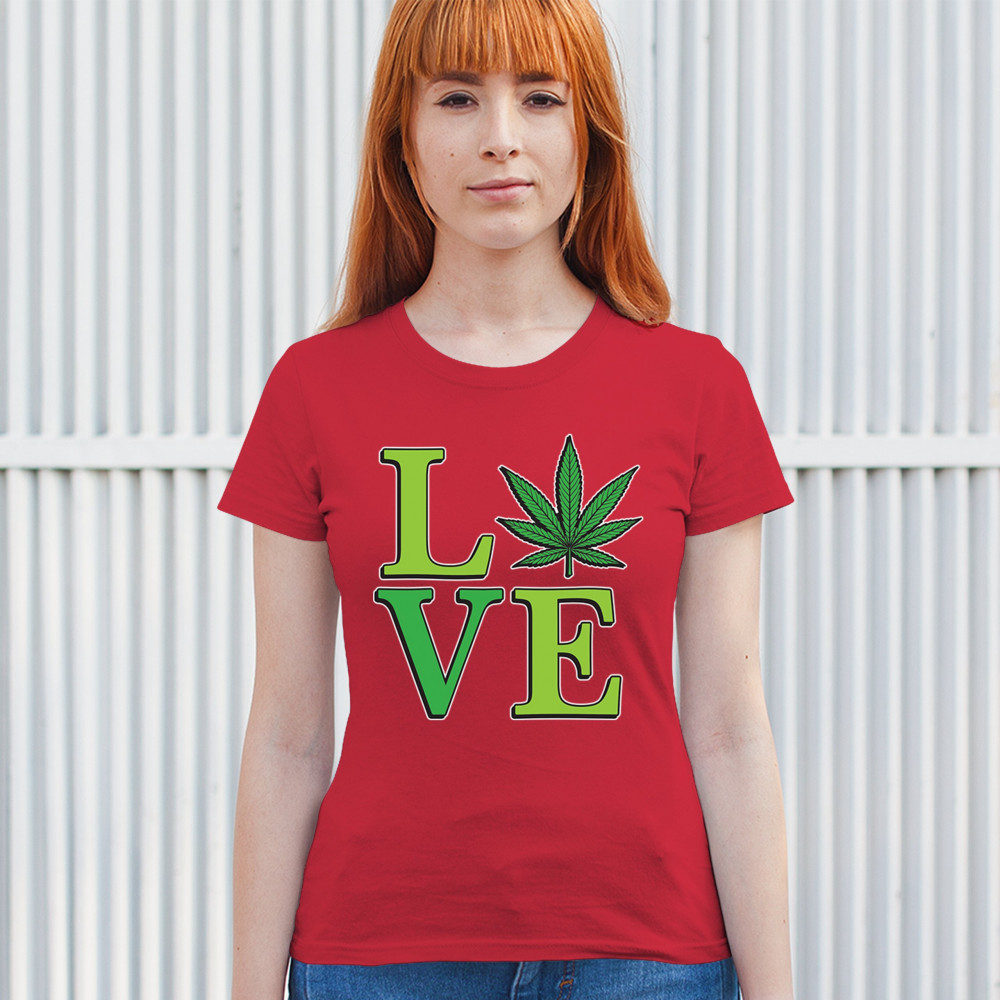 LOVE design with a bold weed leaf. Perfect for 420 fans, stoners, cannabis lifestyle wear, green pride, and marijuana lovers.