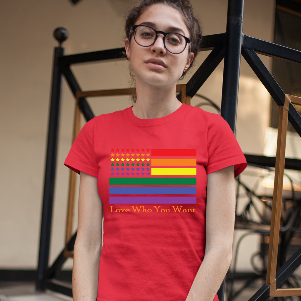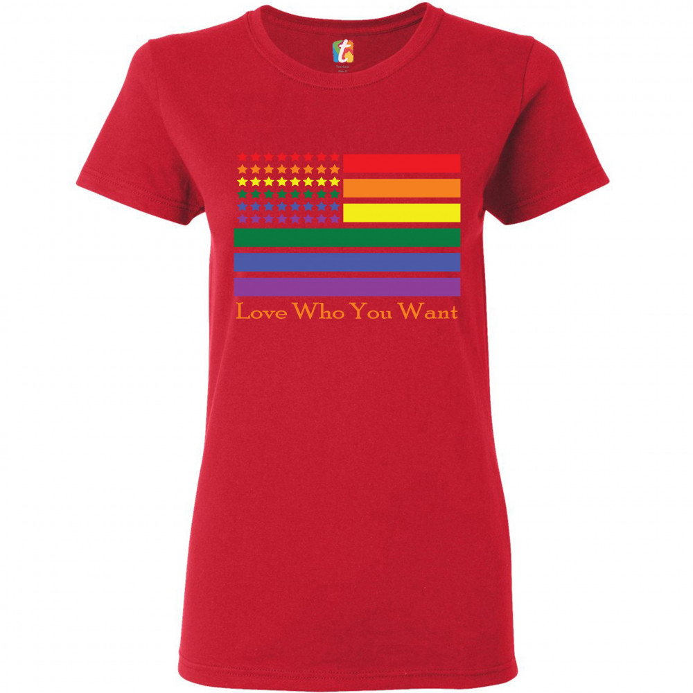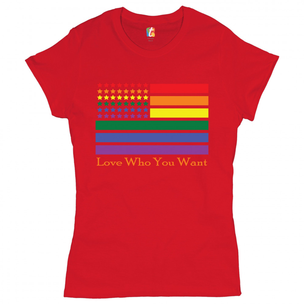 LOVE WHO YOU WANT t-shirt american gay pride rainbow flag lgbt women's tee red