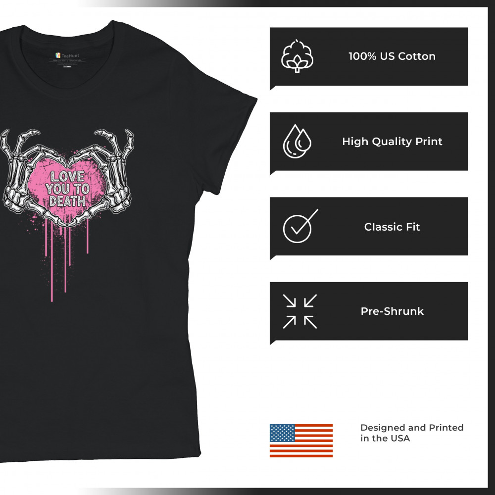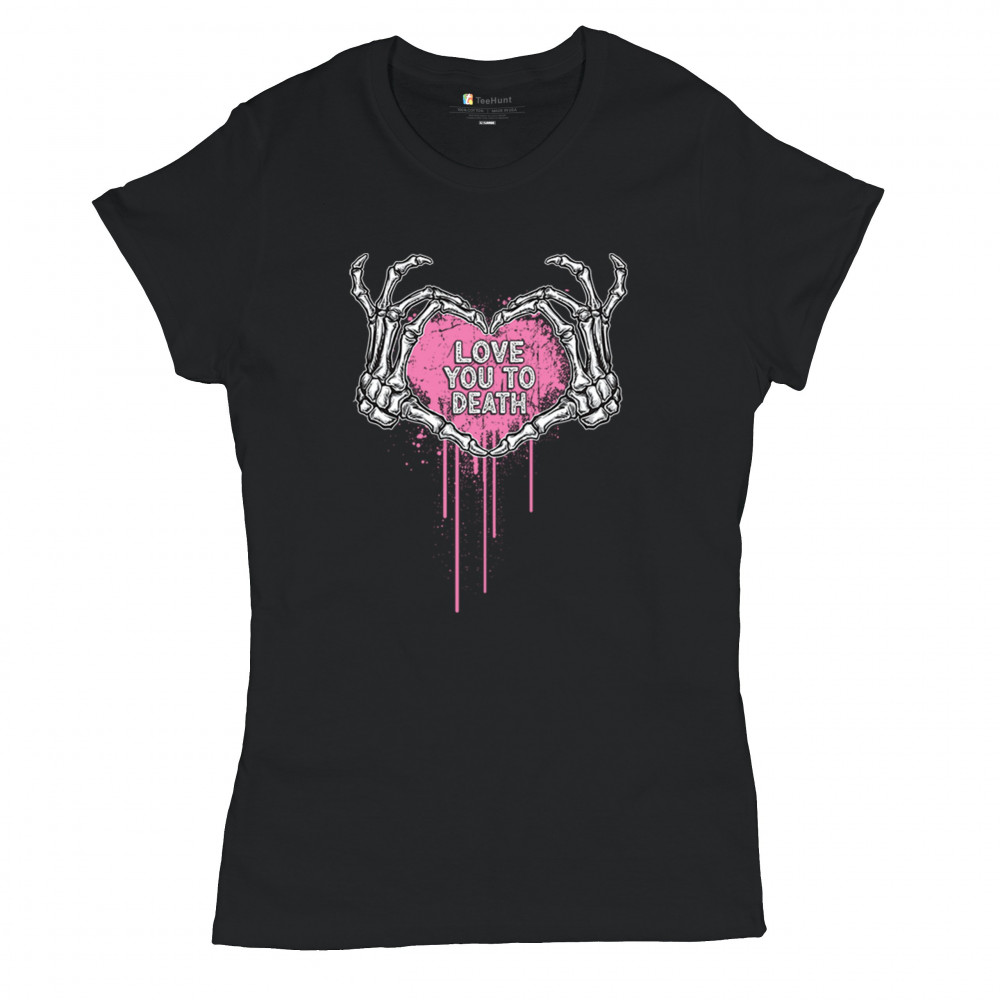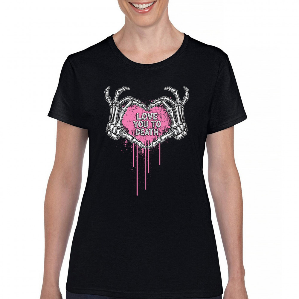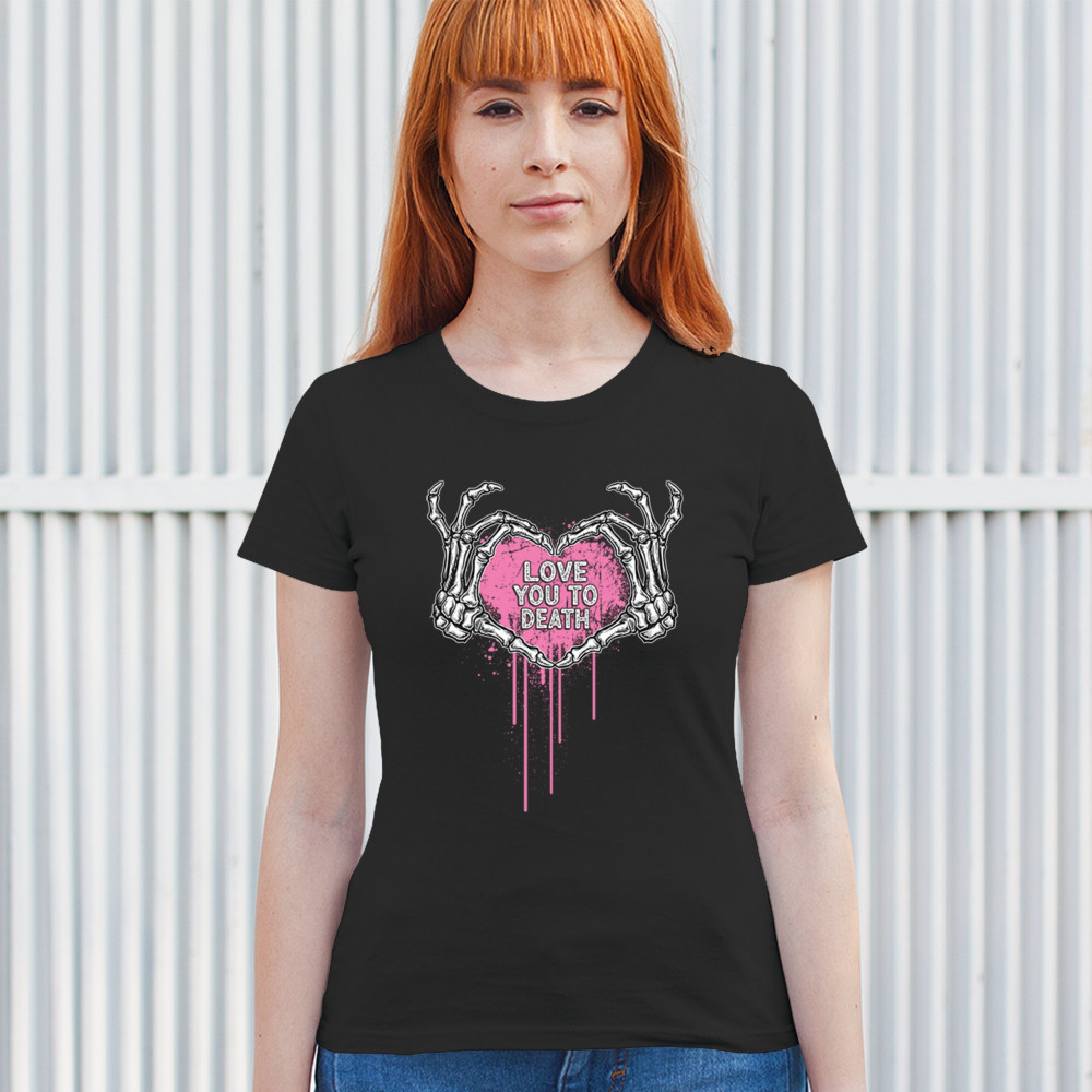 Show your spooky side with this skeleton hands heart design featuring a pink background and the phrase "Love You to Death." A perfect piece for alternative couples, Halloween lovers, and romantic rebels who embrace both affection and dark humor. Great for spooky season, date nights, and alt fashion outfits.