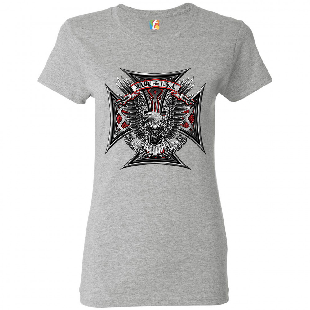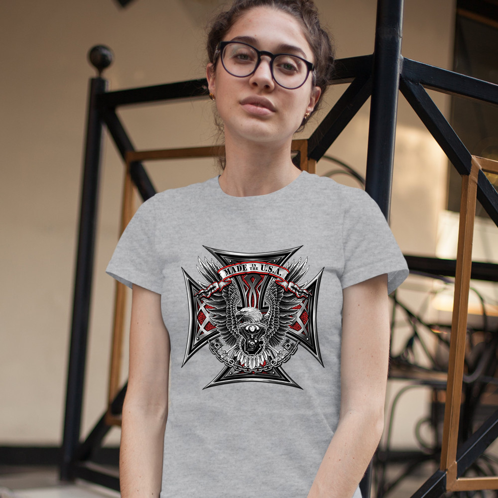 A print featuring a huge cross. In the front there is a bald eagle spreading it's wings and holding pistons in it's talons. In front of it's chest there is a V engine. At the top there is a stripe with "Made in the USA" written on it. A great choice for a