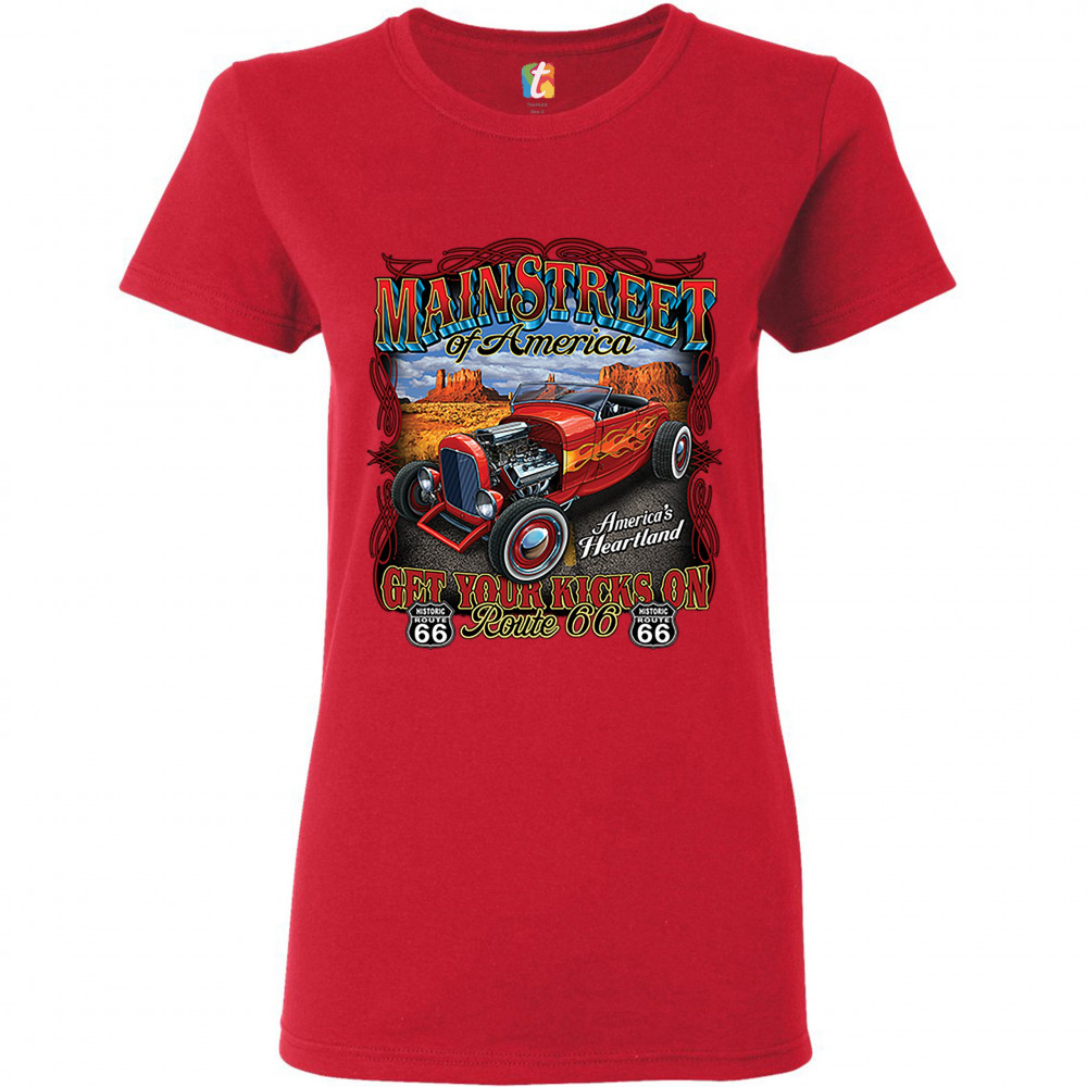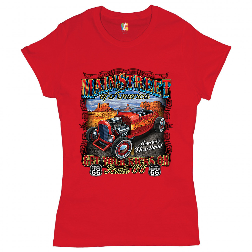 A print featuring a vintage hot rod with an exposed engine and flame paint job parked on a highway. The print says: "Main Street of America", "America's Heartland" and "Get Your Kicks on Route 66". The print also features two Route 66 signs. A great choic