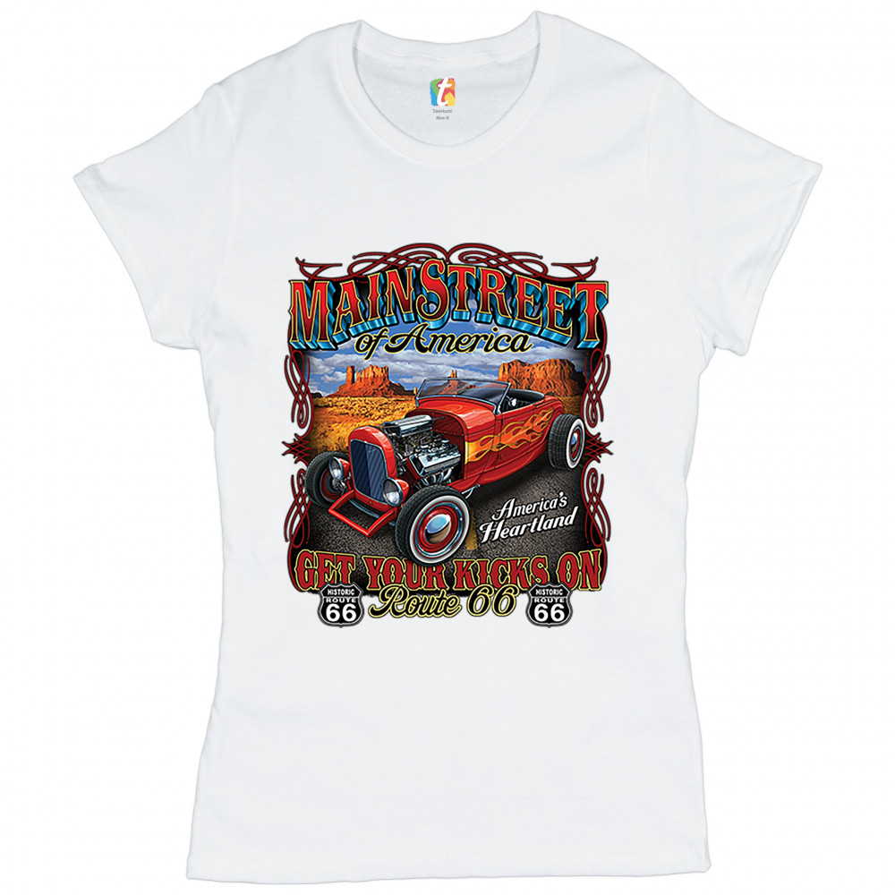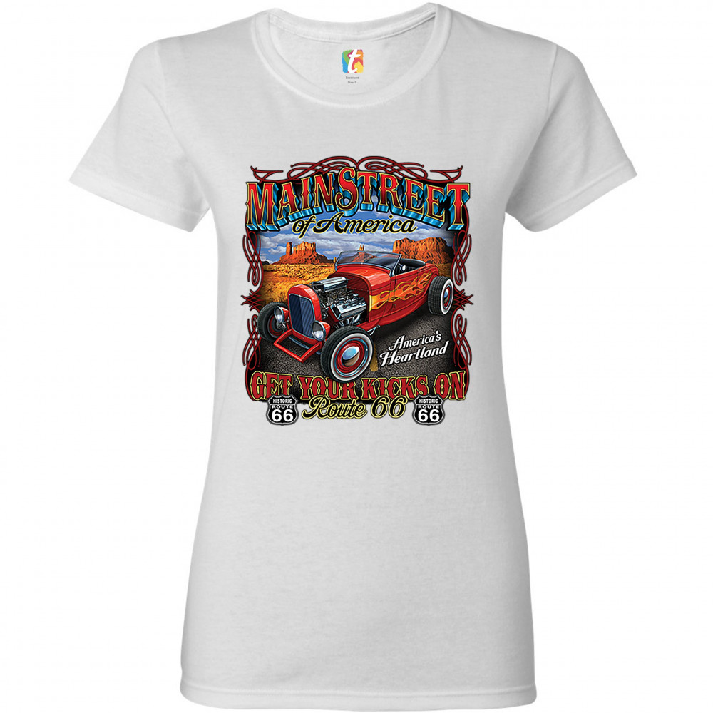 MAIN STREET OF AMERICA t-shirt america's heartland route 66 hot rod women's tee white