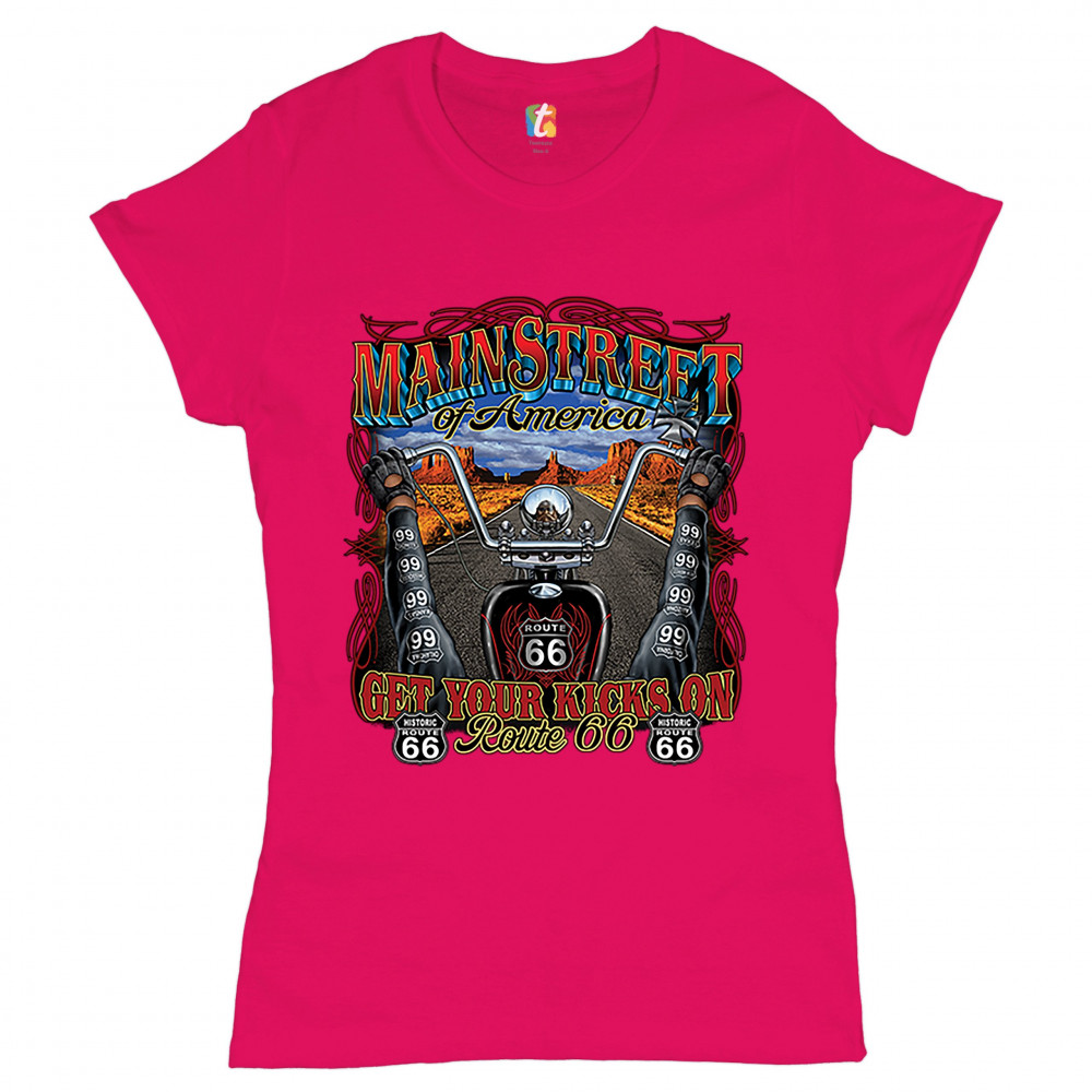 A print featuring a POV of a biker riding a chopper on a Route 66. There are are numerous "Route 66" and "Historic Route 66" signs all over the print and the print says: "Main street of America" and "Gwt your kicks on Route 66". A great choice for a motor