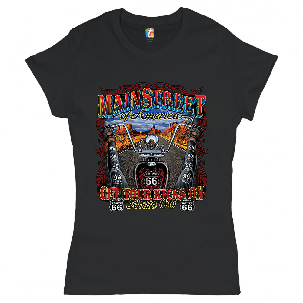 A print featuring a POV of a biker riding a chopper on a Route 66. There are are numerous "Route 66" and "Historic Route 66" signs all over the print and the print says: "Main street of America" and "Gwt your kicks on Route 66". A great choice for a motor