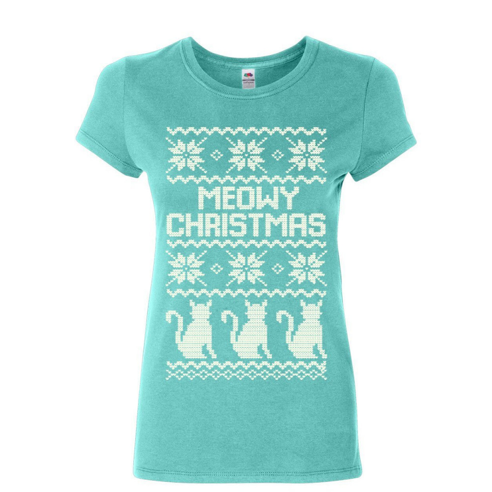 MEOWY CHRISTMAS women's t-shirt cat christmas xmas ugly sweatshirt cotton tee light blue