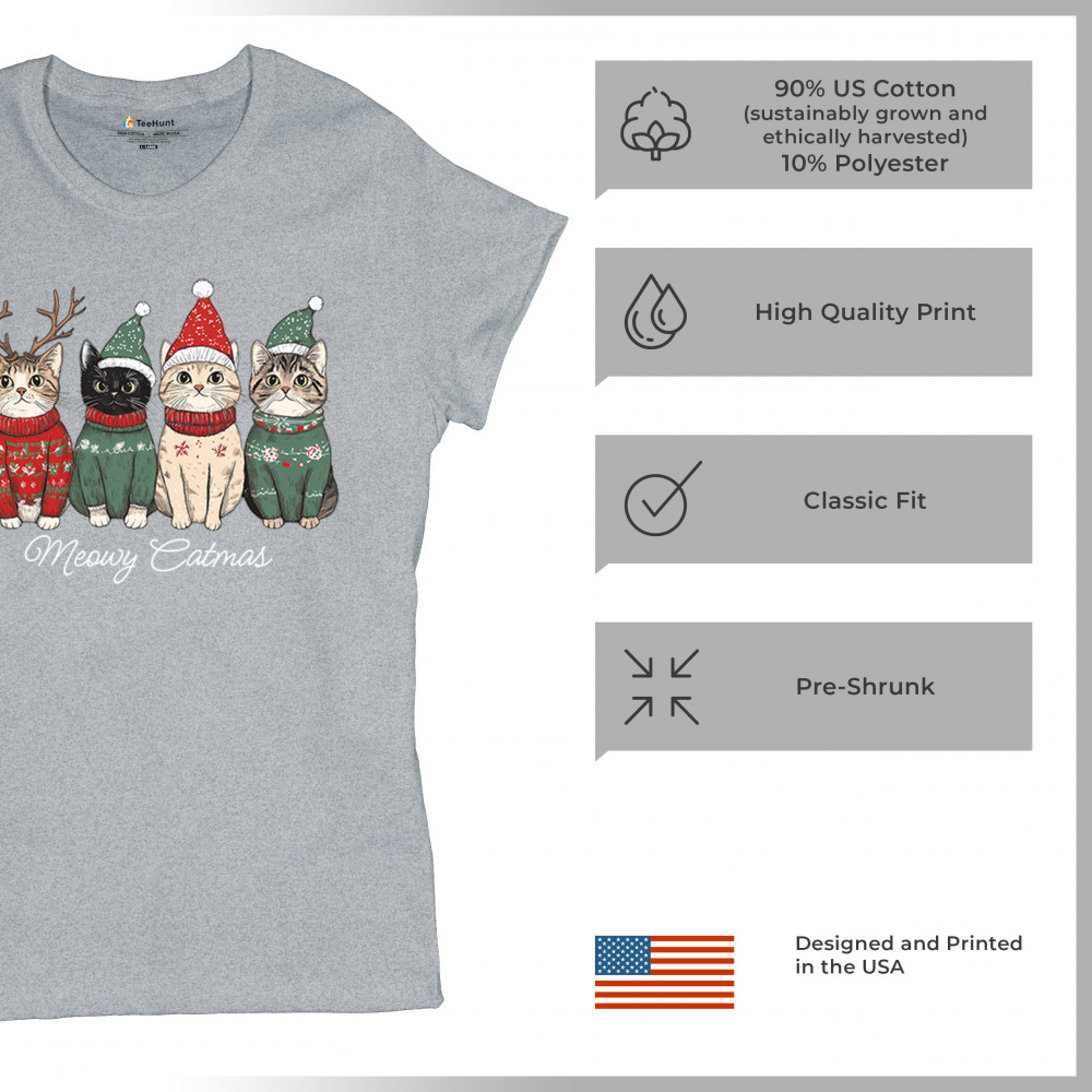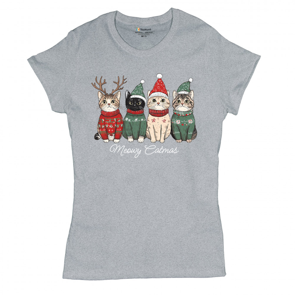 Cute Meowy Catmas design with festive kittens, perfect for cat lovers wanting a cozy holiday graphic and fun Christmas pet theme.