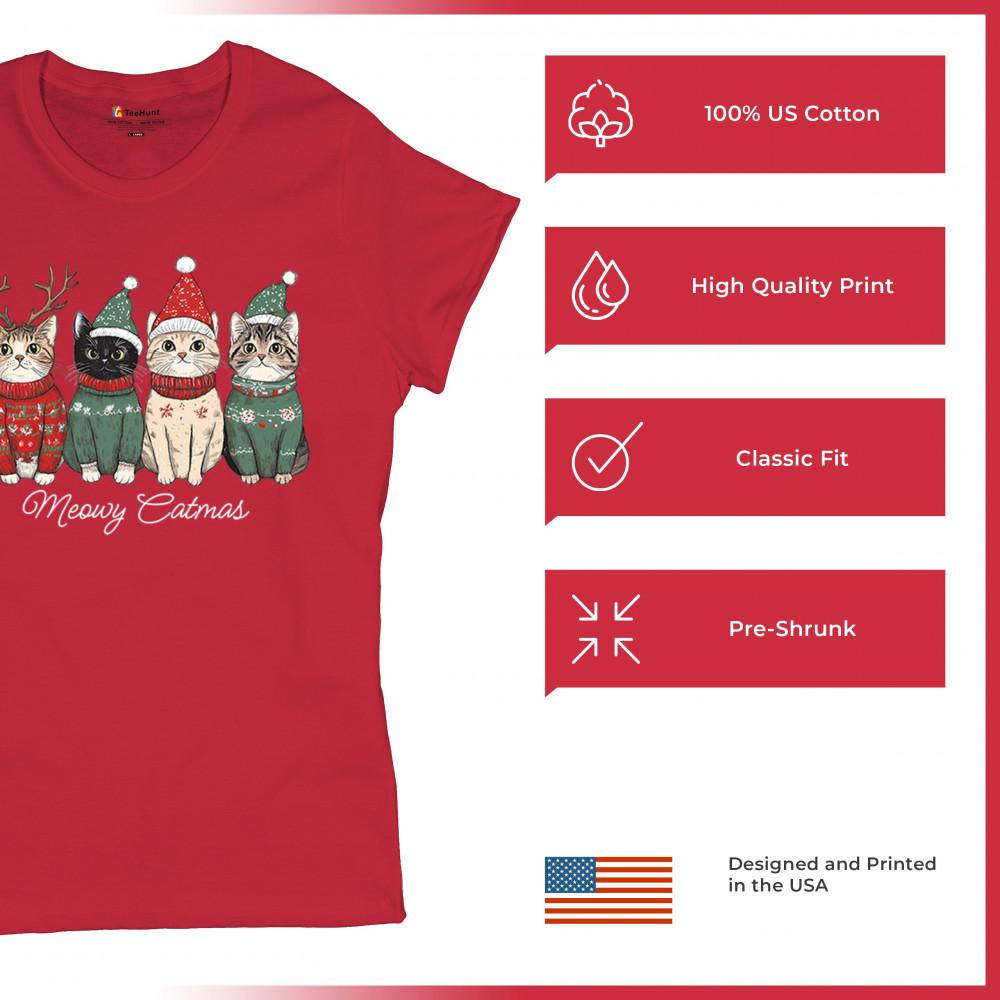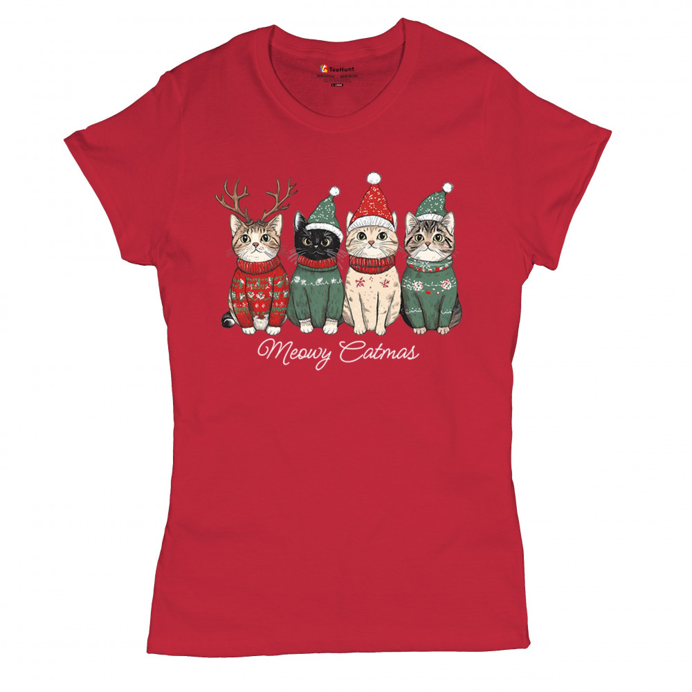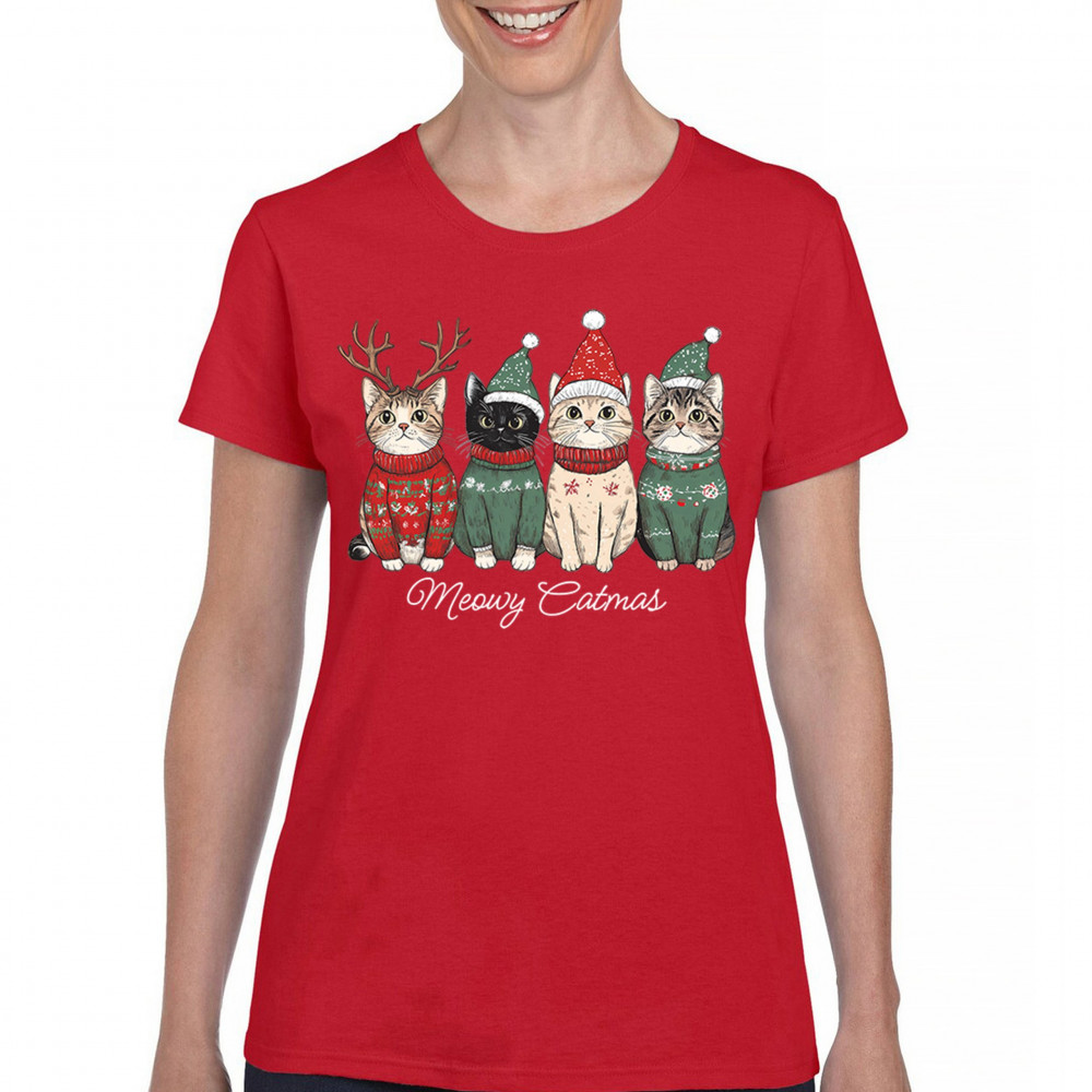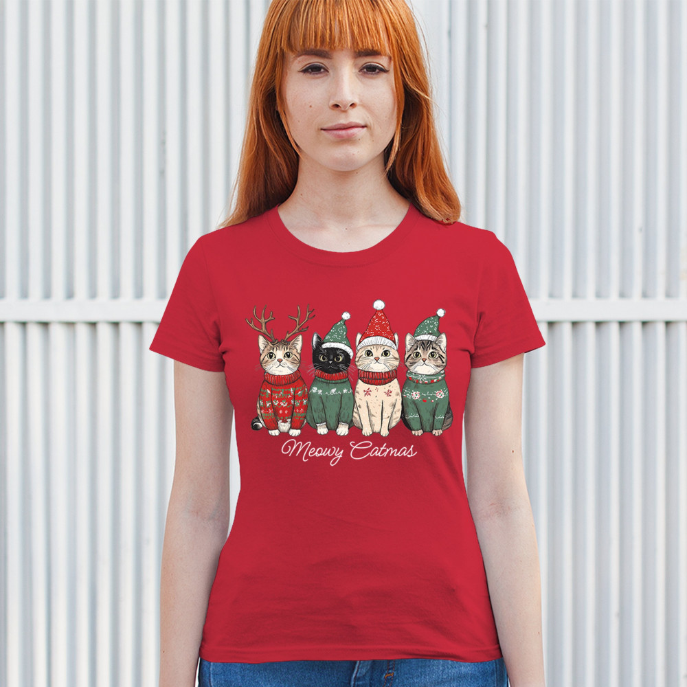 Cute Meowy Catmas design with festive kittens, perfect for cat lovers wanting a cozy holiday graphic and fun Christmas pet theme.