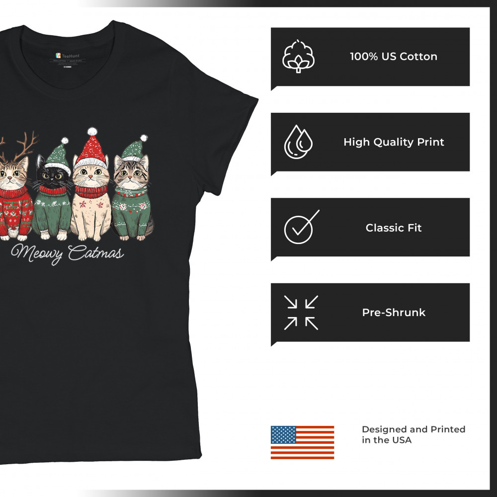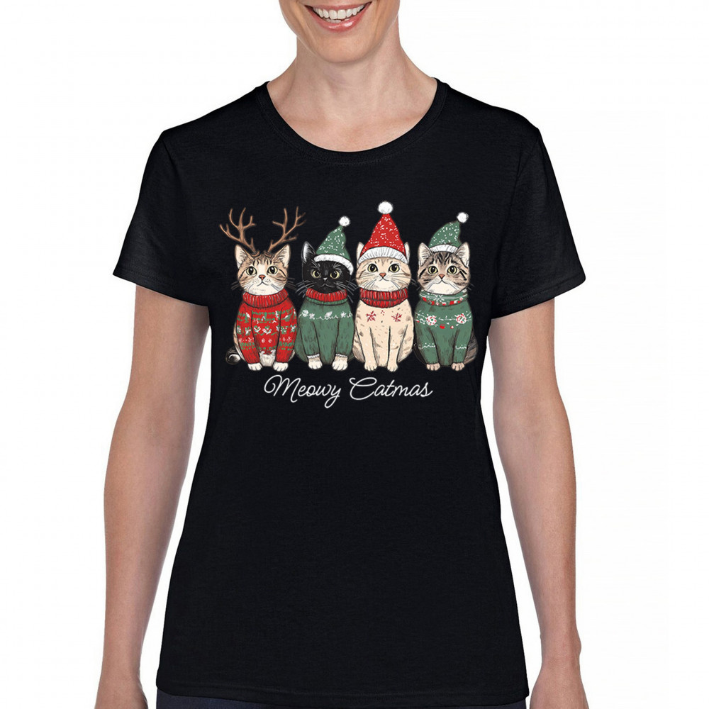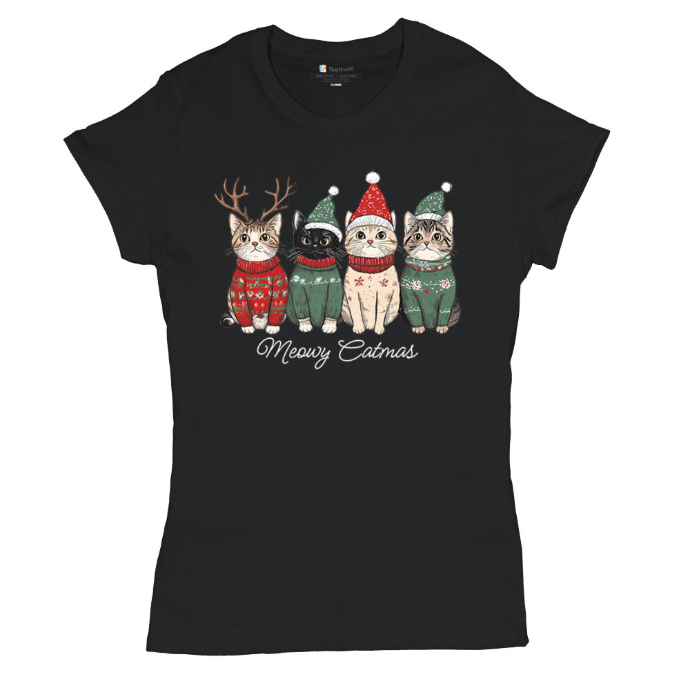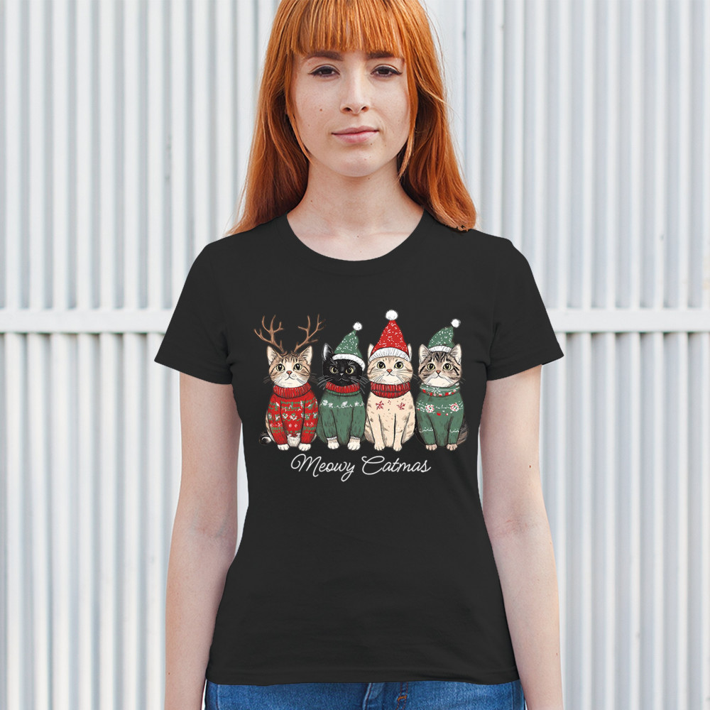 Cute Meowy Catmas design with festive kittens, perfect for cat lovers wanting a cozy holiday graphic and fun Christmas pet theme.