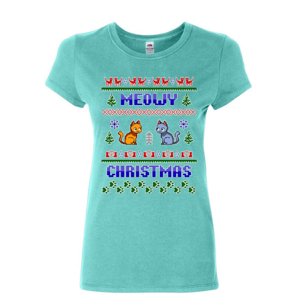MEOWY CHRISTMAS UGLY SWEATER women's t-shirt cat kitten purr merry xmas shirt light blue