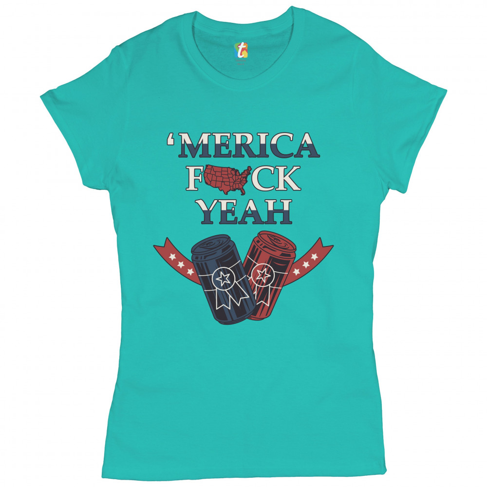 A patriotic print saying "'Merica F*ck Yeah" with a silhouette of the continental USA instead of the letter "u" and two cans of beer. Great choice to wear on Independence Day or any other patriotic holiday.