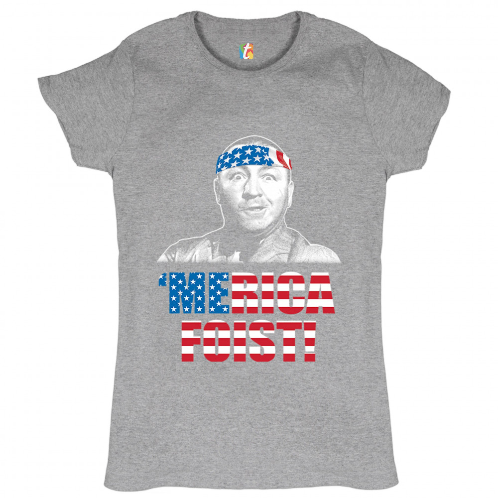A funny patriotic print saying: "'Merica Foist" and depicting grinning Curly Howard wearing an American flag bandana. The words are decorated with the Stars and Stripes of the American flag. A great gift for anyone who is a fan of the legendary TV show.