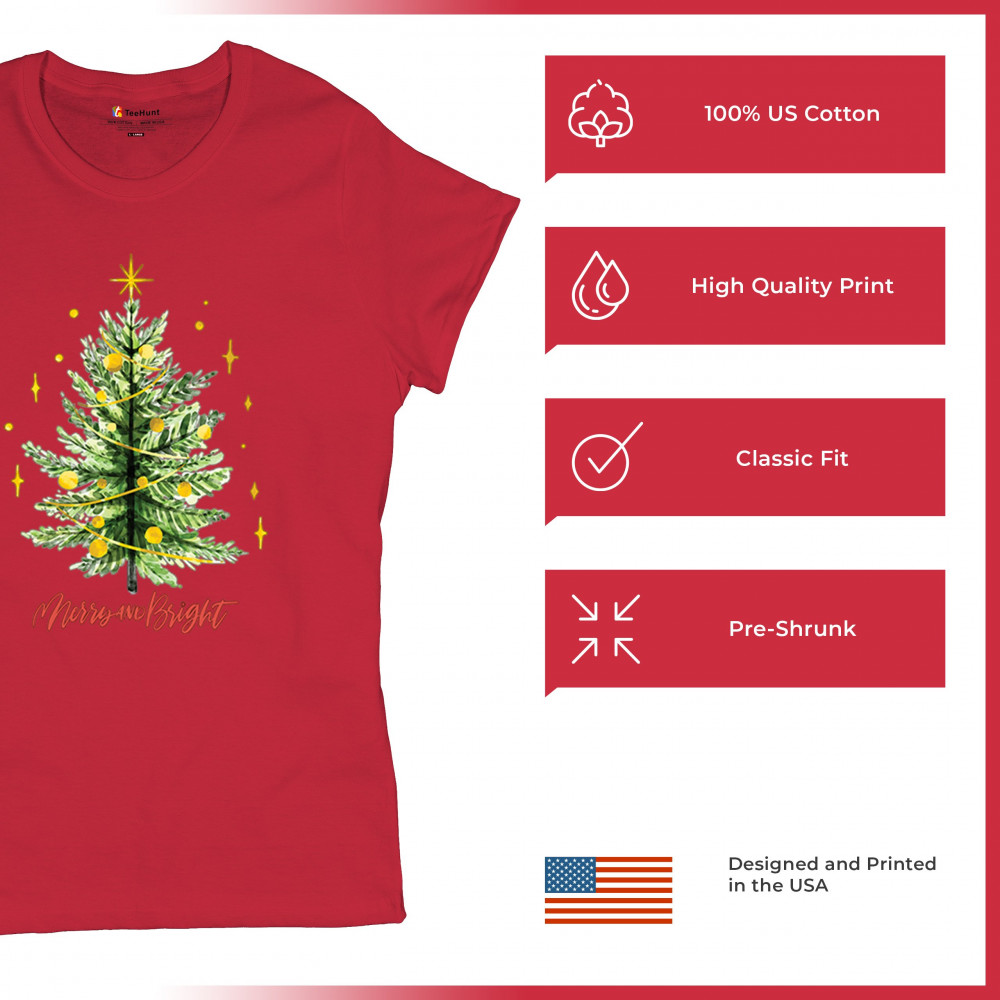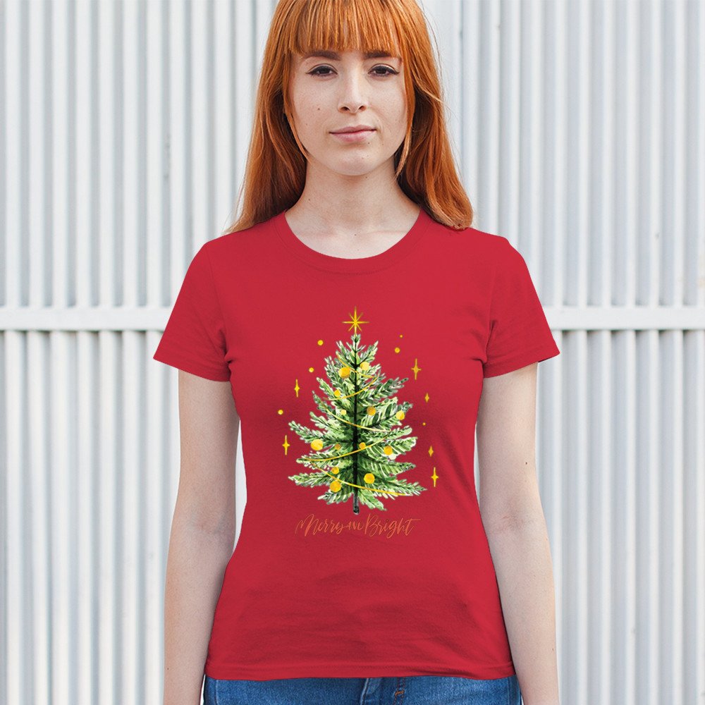 Festive “Merry and Bright†shirt featuring a joyful Christmas tree. Perfect for holiday gatherings, office parties, or Secret Santa gifts.