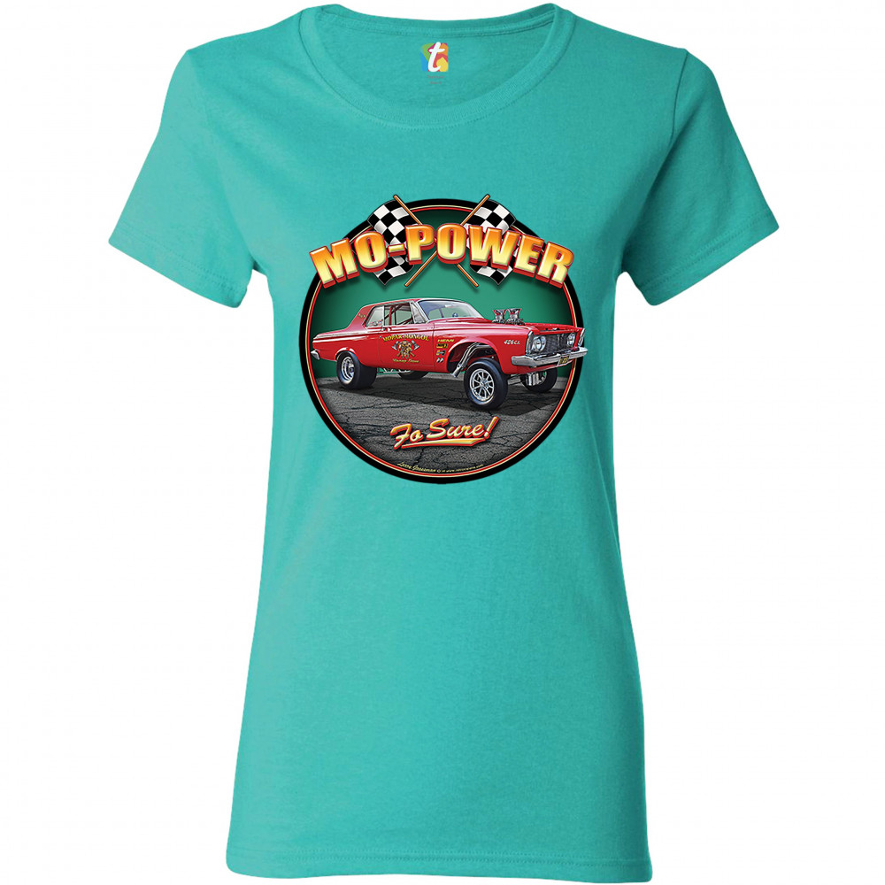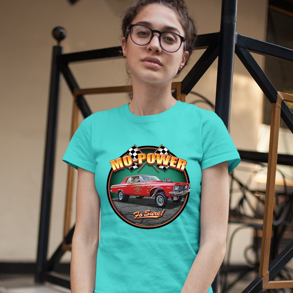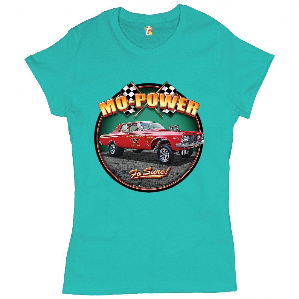 MO-POWER FO SURE! t-shirt american muscle car racing route 66 women's tee light blue