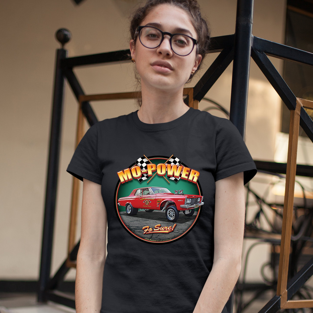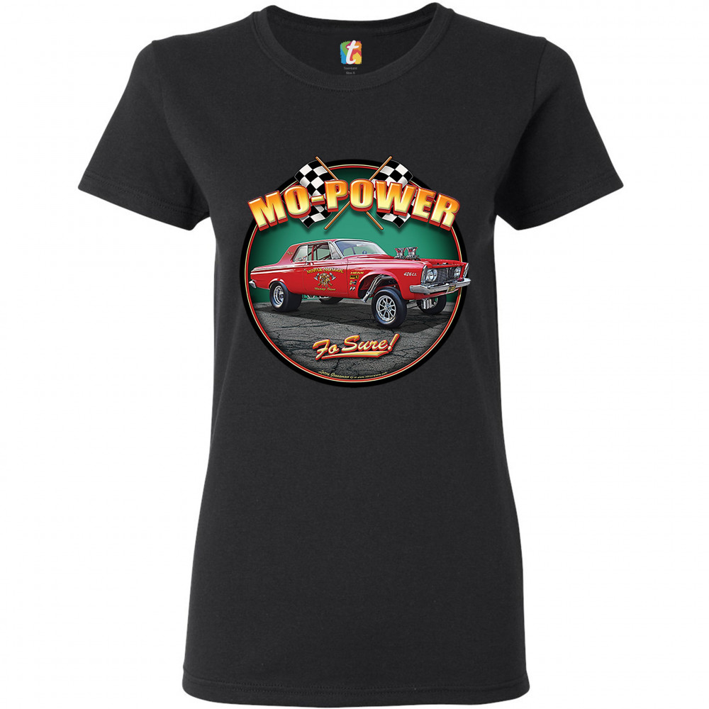 MO-POWER FO SURE! t-shirt american muscle car racing route 66 women's tee black