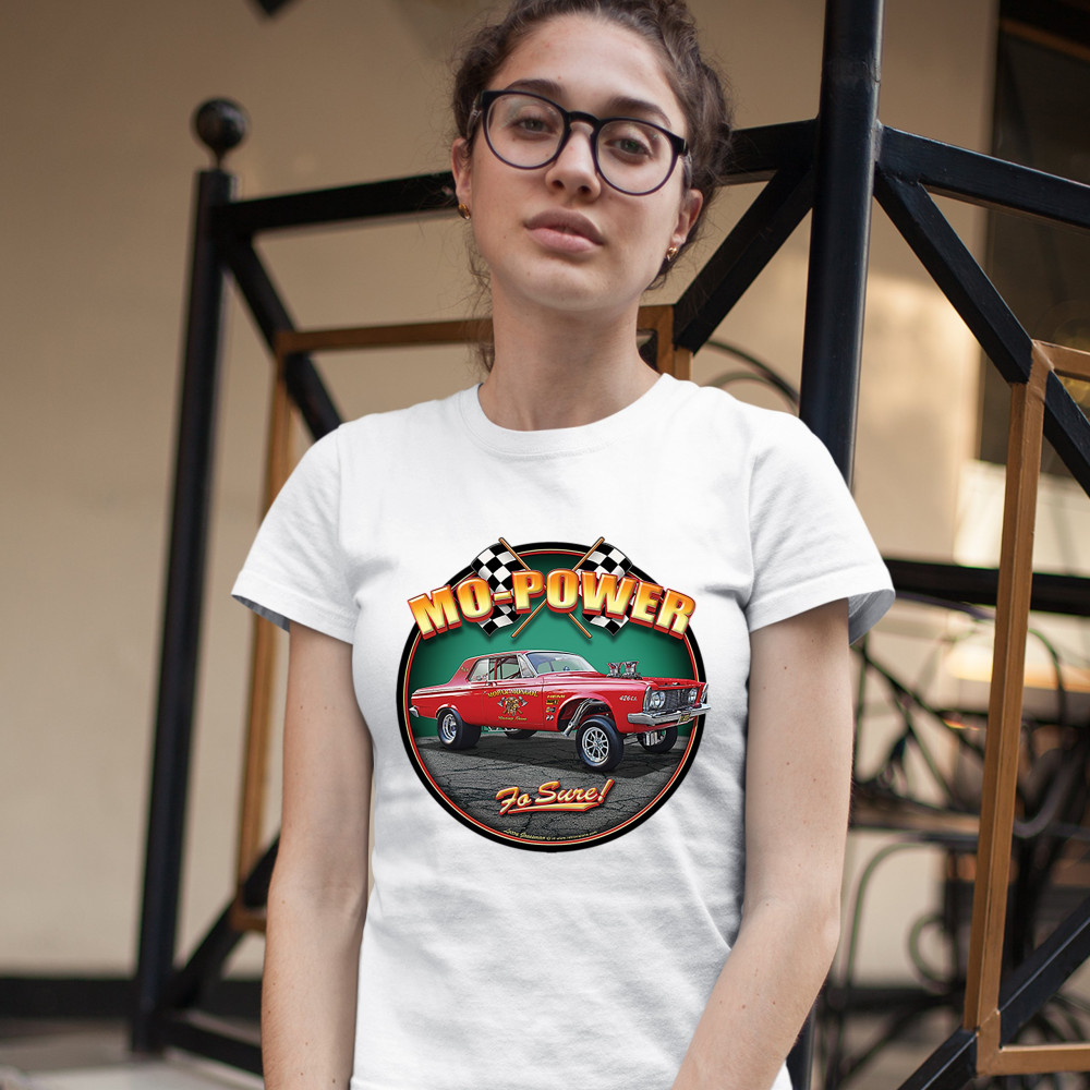 MO-POWER FO SURE! t-shirt american muscle car racing route 66 women's tee white