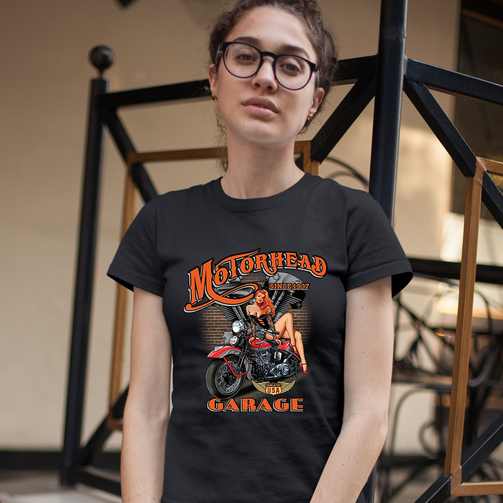 A print featuring a sexy pin-up girl sitting on a motorcycle. In the background there is a motorcycle engine and a brick wall. The print says: "Motorhead Garage since 1937" and features a "Made in the USA" sign. A great choice for a motorcycle enthusiast.