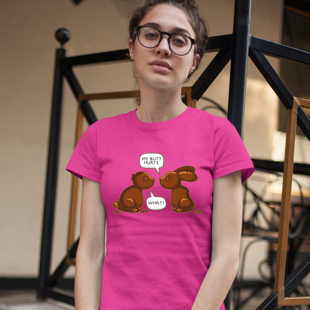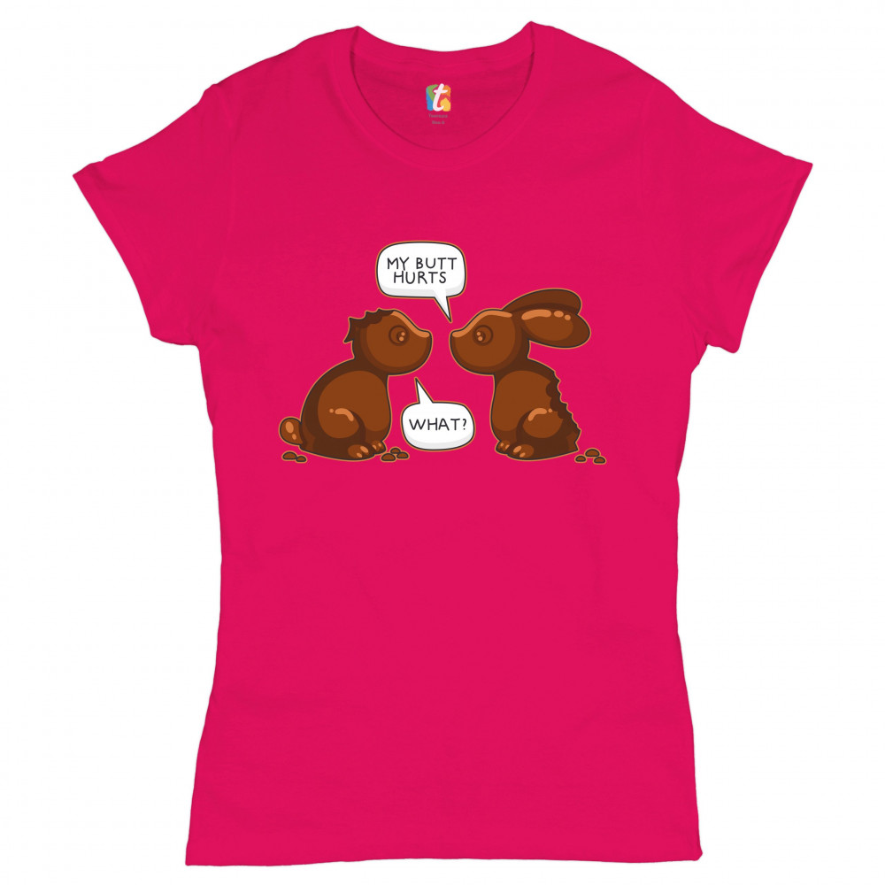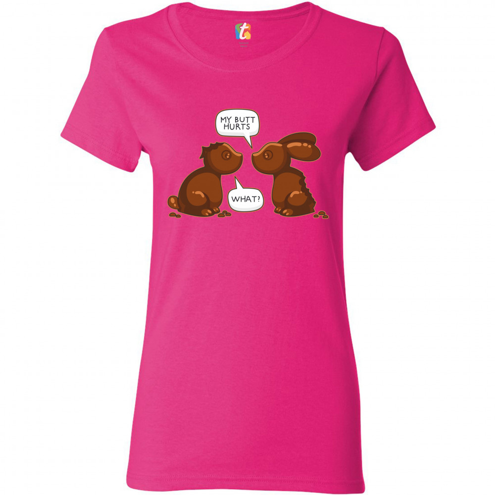 MY BUTT HURTS - WHAT? t-shirt chocolate bunnies easter rabbits women's tee pink