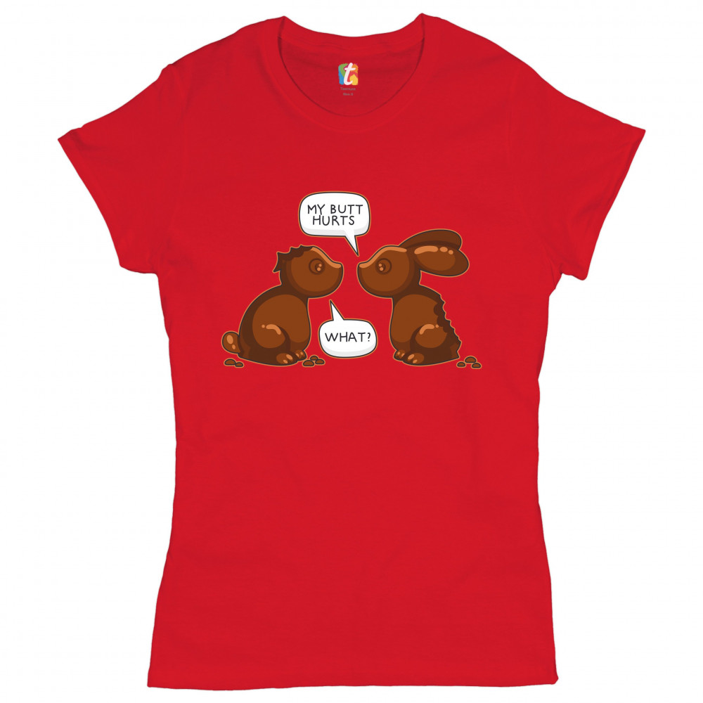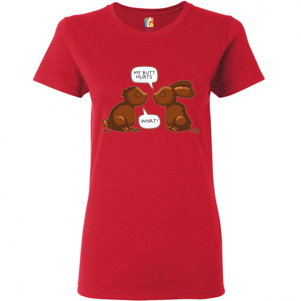 MY BUTT HURTS - WHAT? t-shirt chocolate bunnies easter rabbits women's tee red