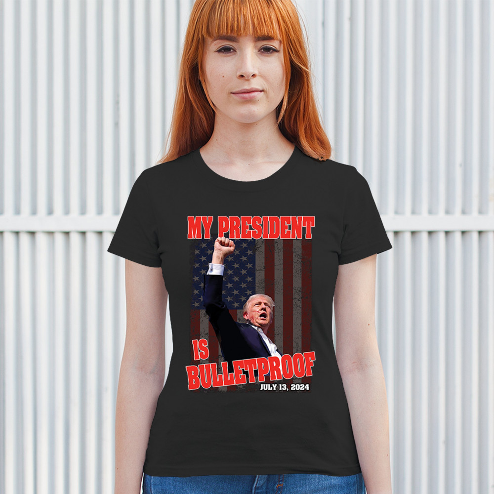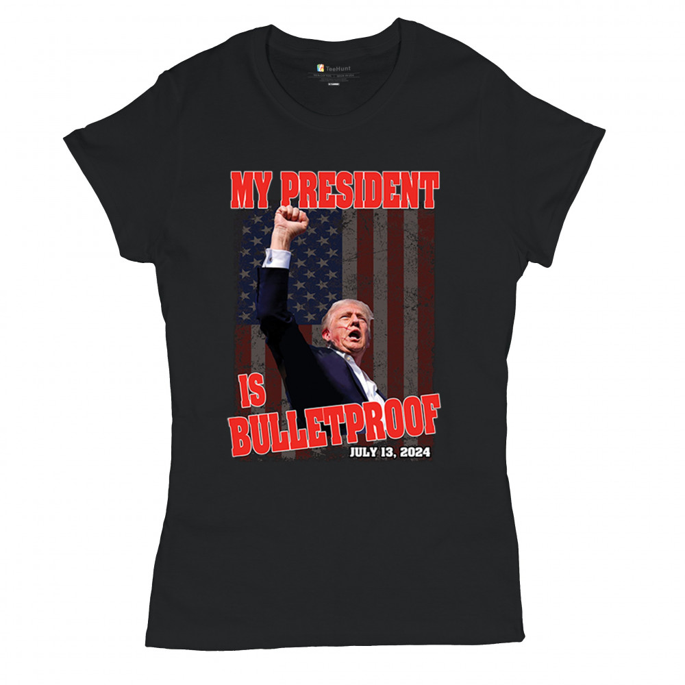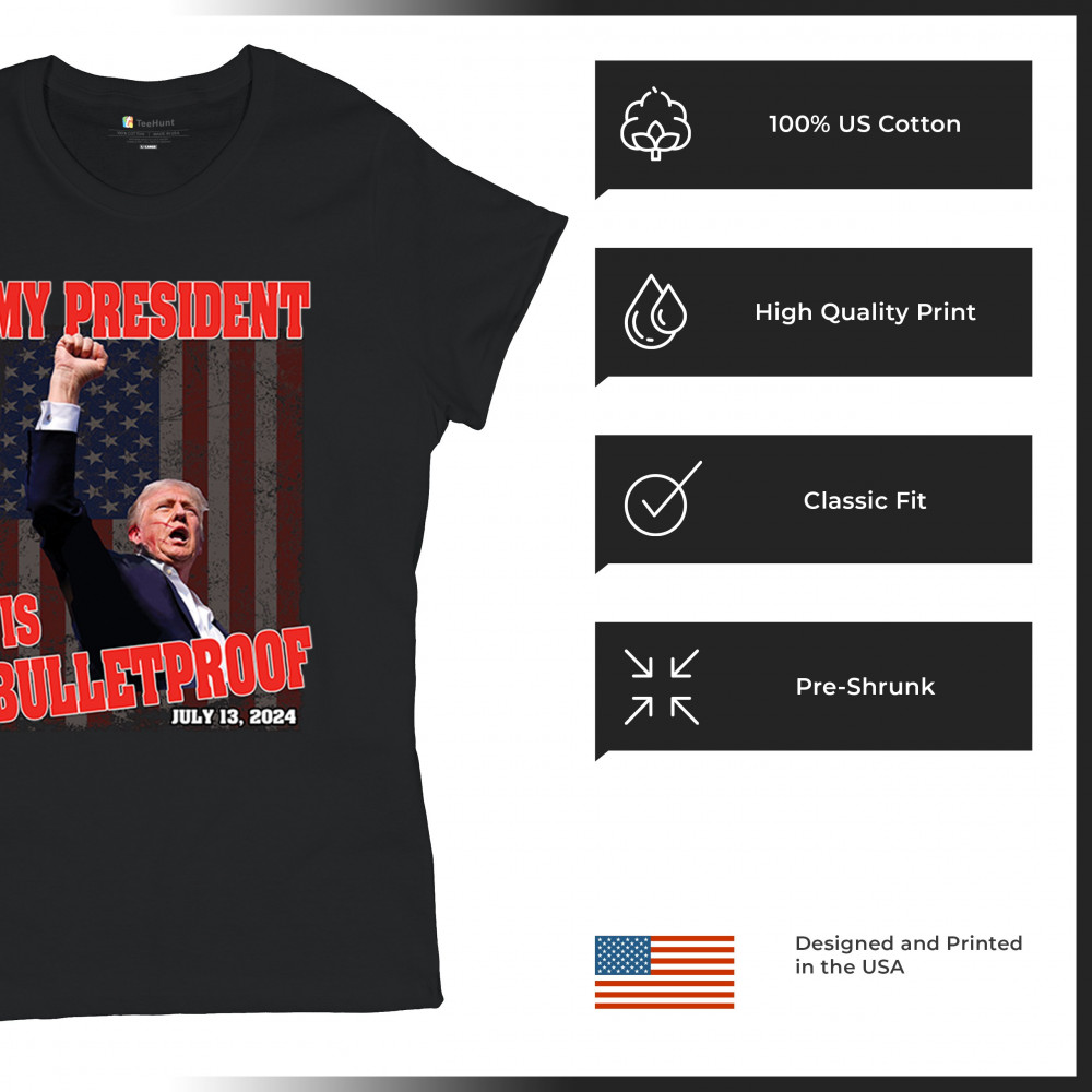 MY PRESIDENT IS BULLETPROOF TRUMP 24 t-shirt take america back maga women's tee black