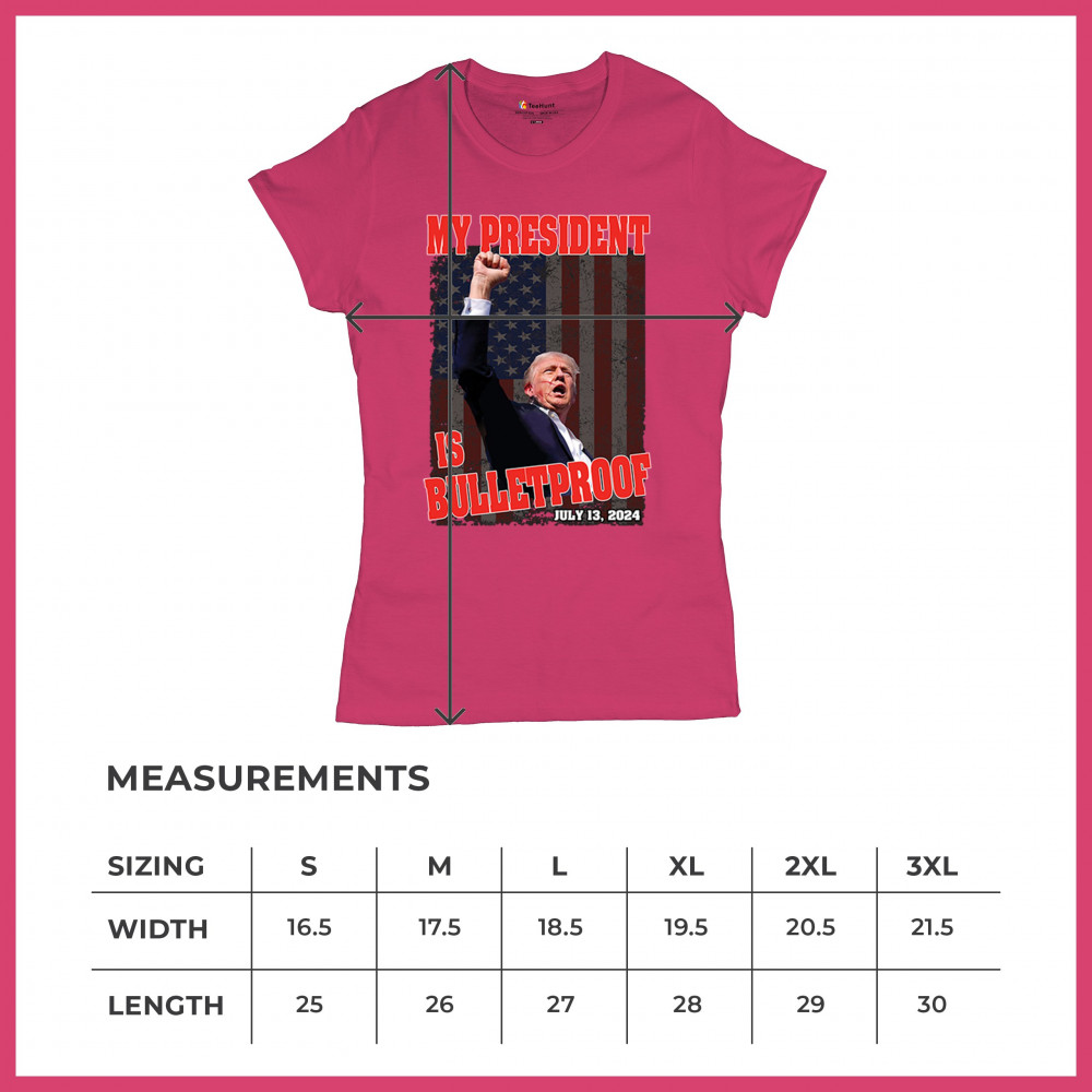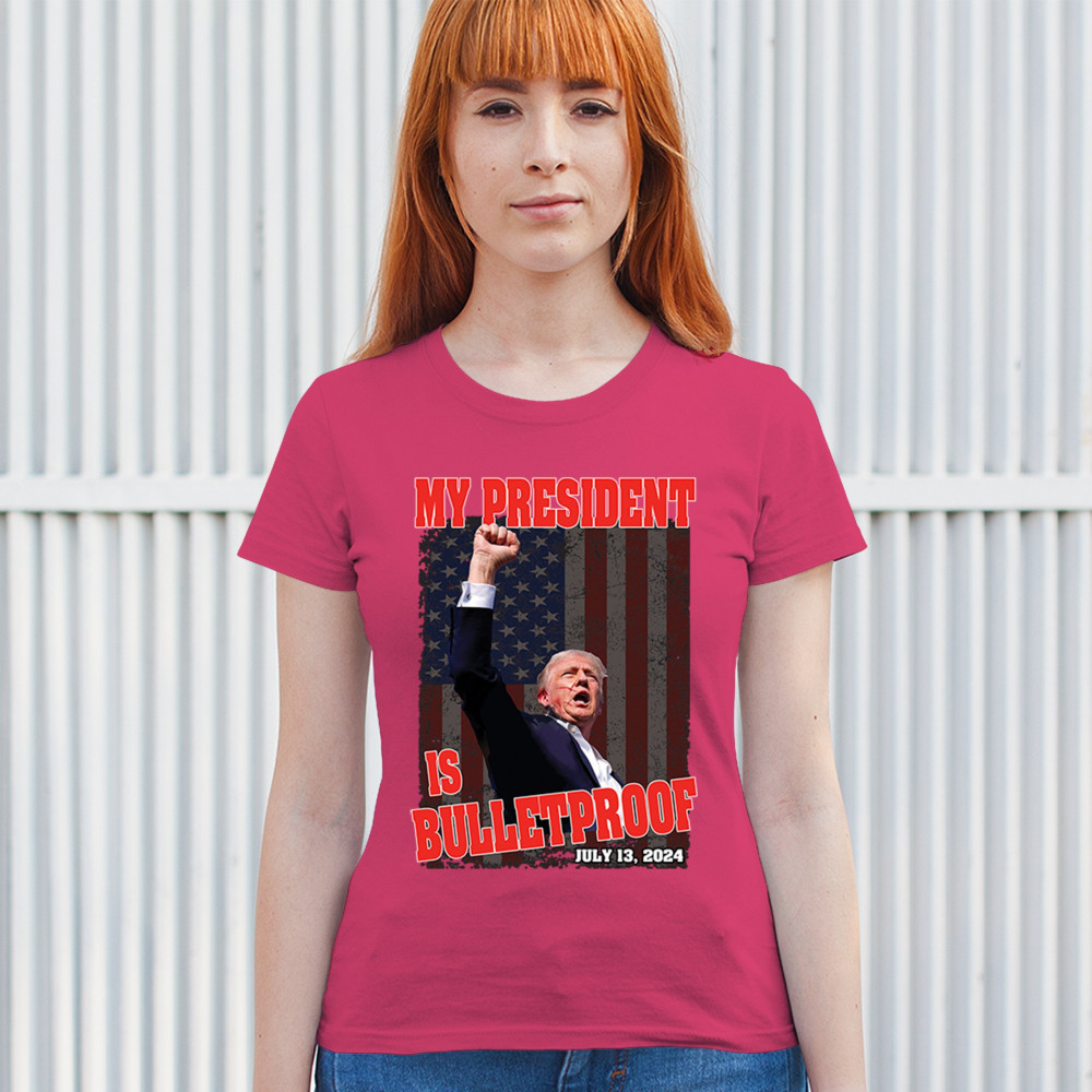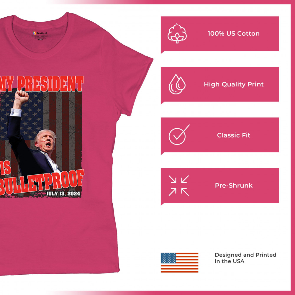 Support Trump with our "My President is Bulletproof" design, perfect for rallies and everyday wear. Show your patriotic pride and conservative values.