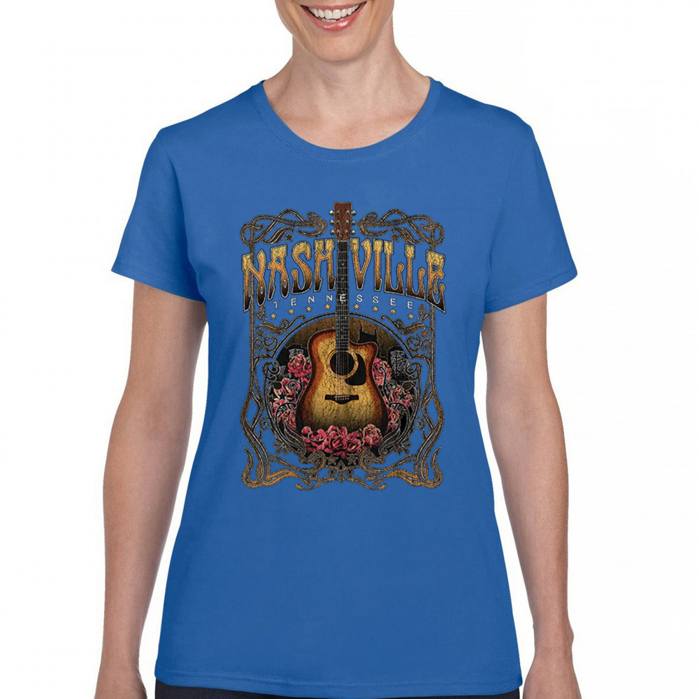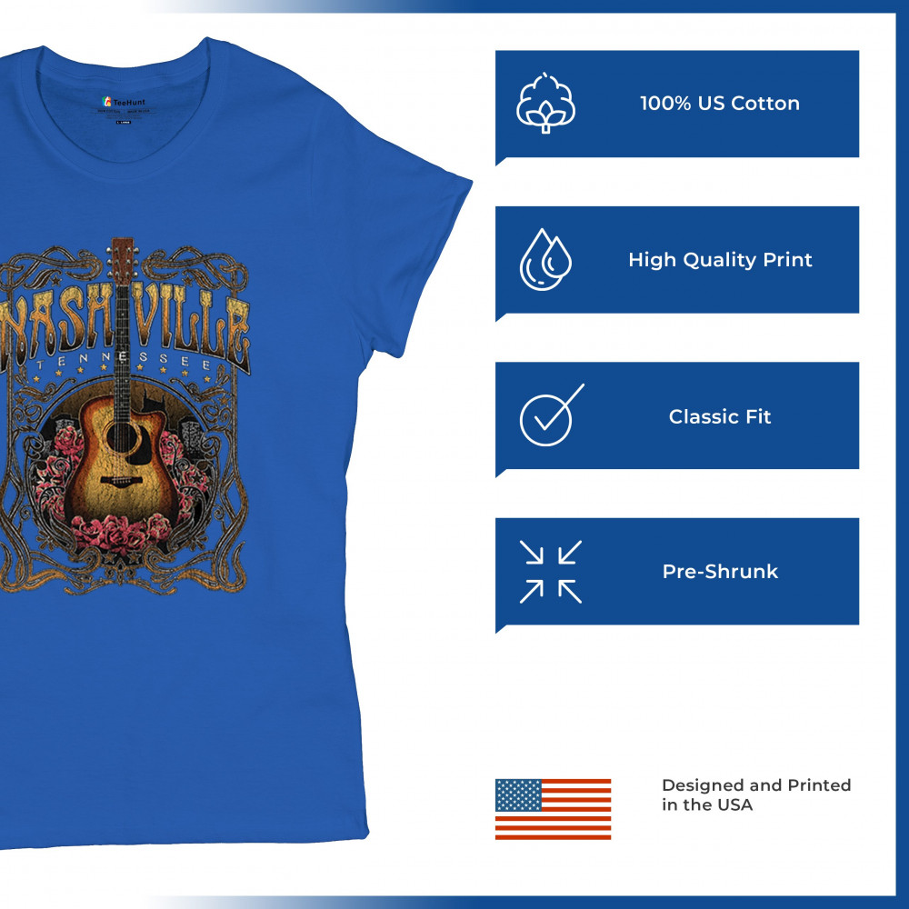 Vintage Nashville Tennessee design with rustic guitar and roses. Great for concerts, country music fans, road trips, and souvenir wear.