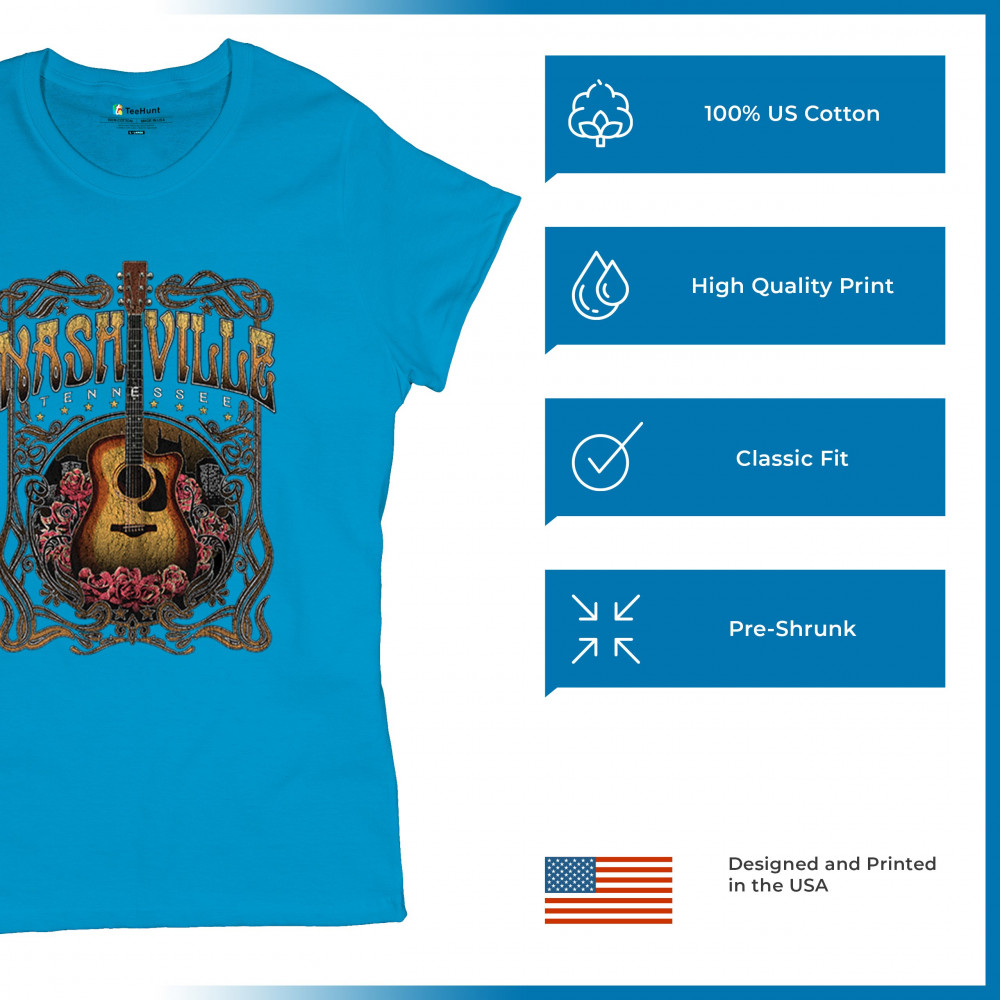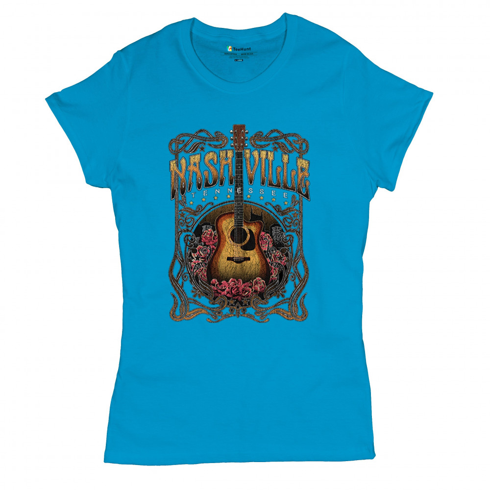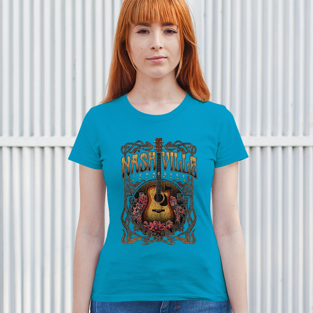 Vintage Nashville Tennessee design with rustic guitar and roses. Great for concerts, country music fans, road trips, and souvenir wear.