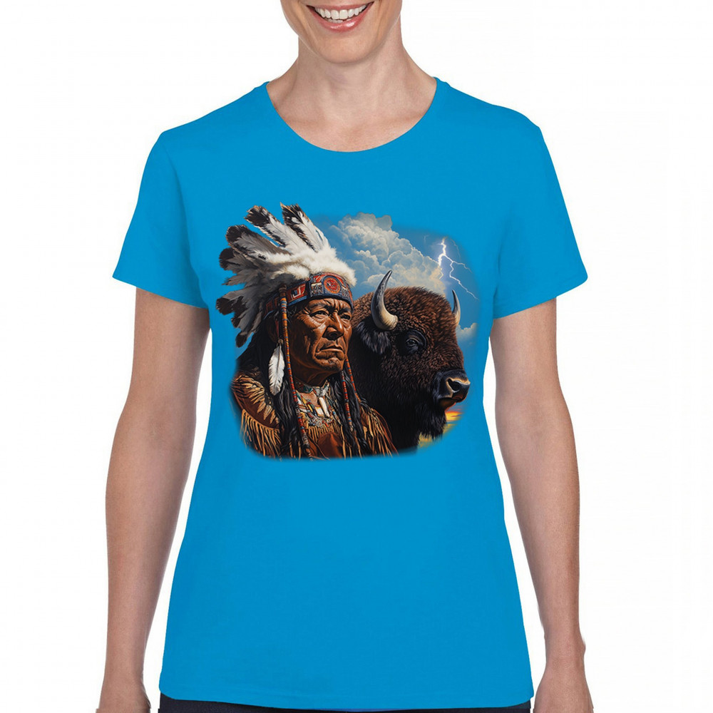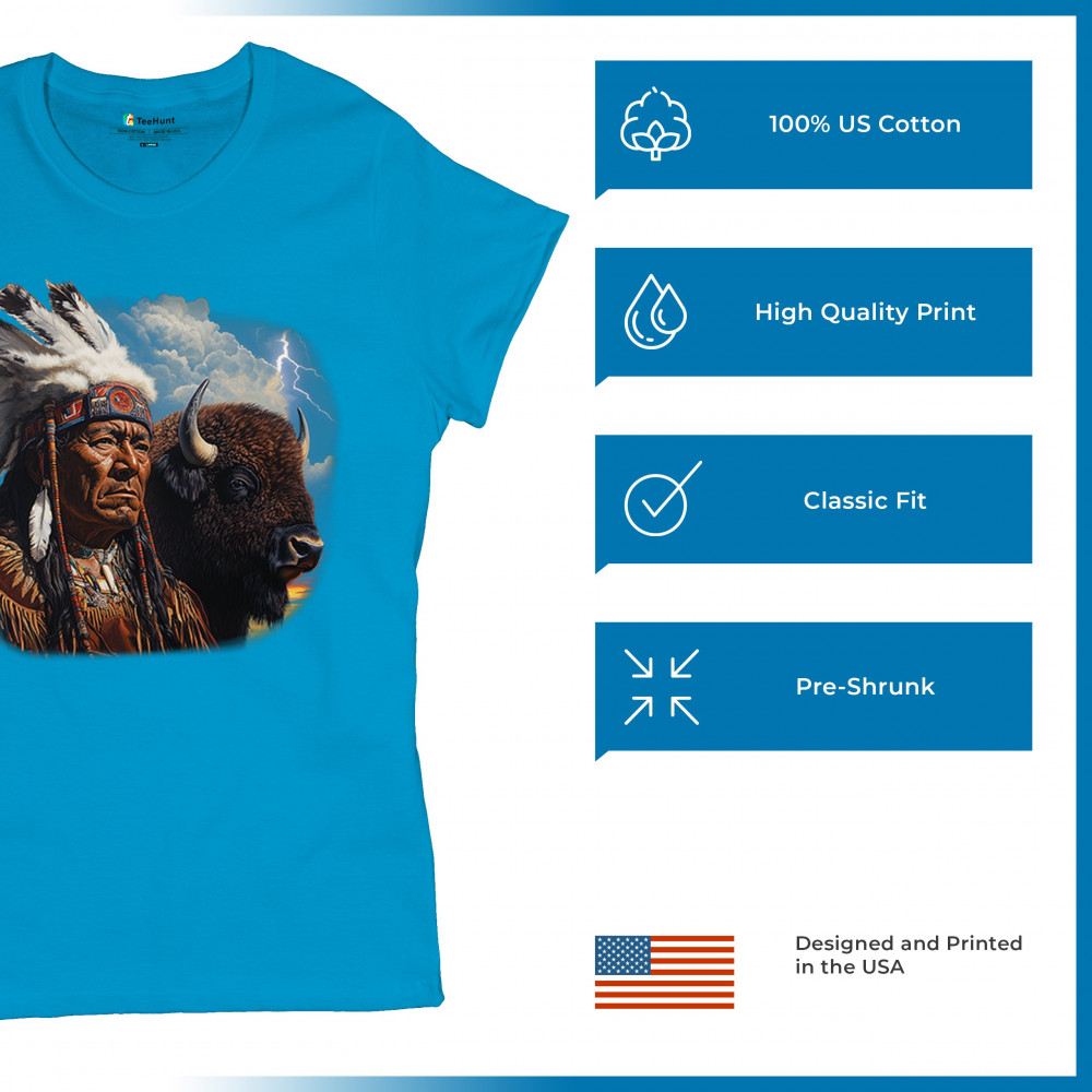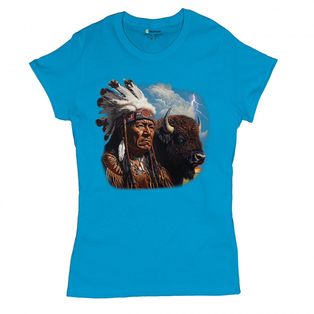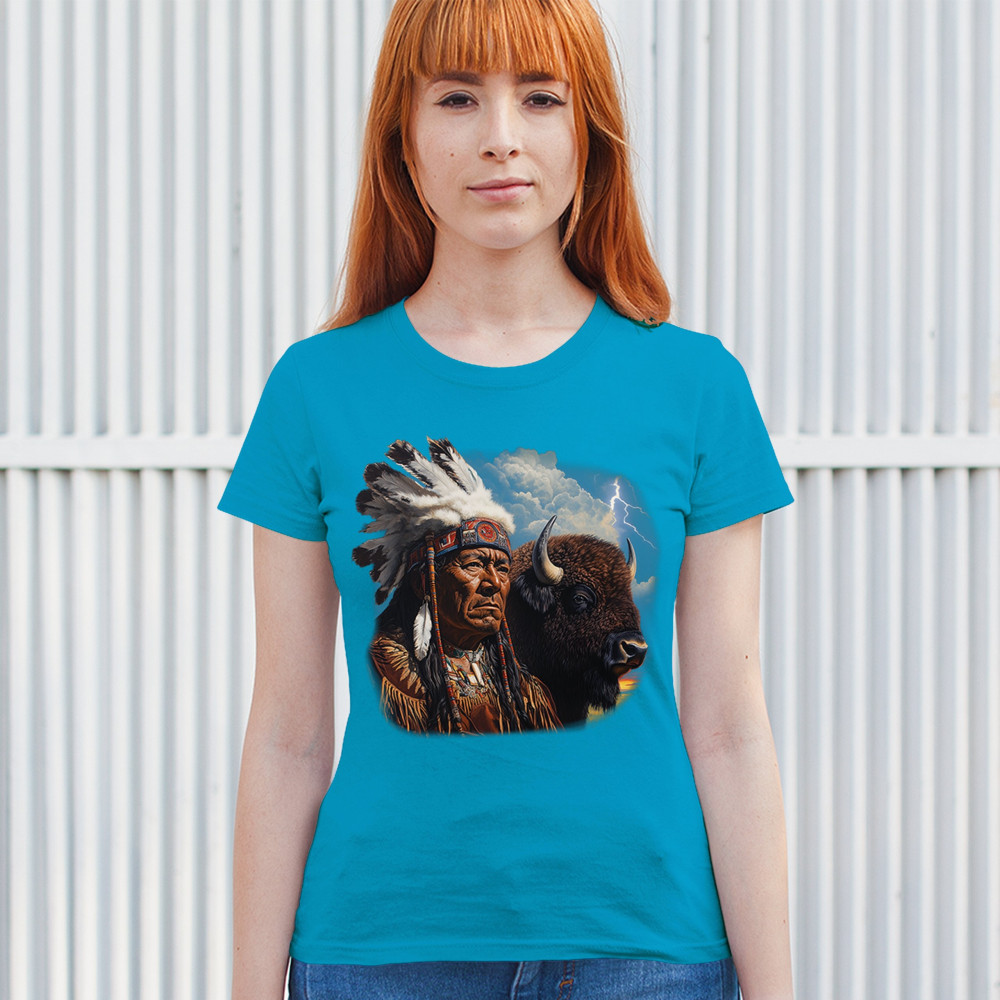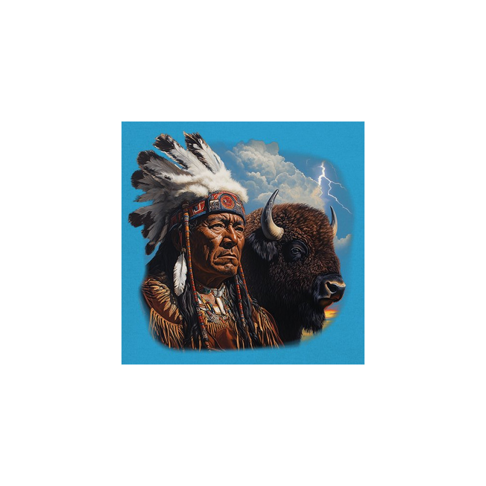 This powerful design features a Native American elder in traditional dress and feathered headdress beside a noble bison. Framed by a stormy sky and lightning, the art symbolizes tribal pride, spiritual harmony, ancestral strength, and a deep connection to nature’s raw energy.