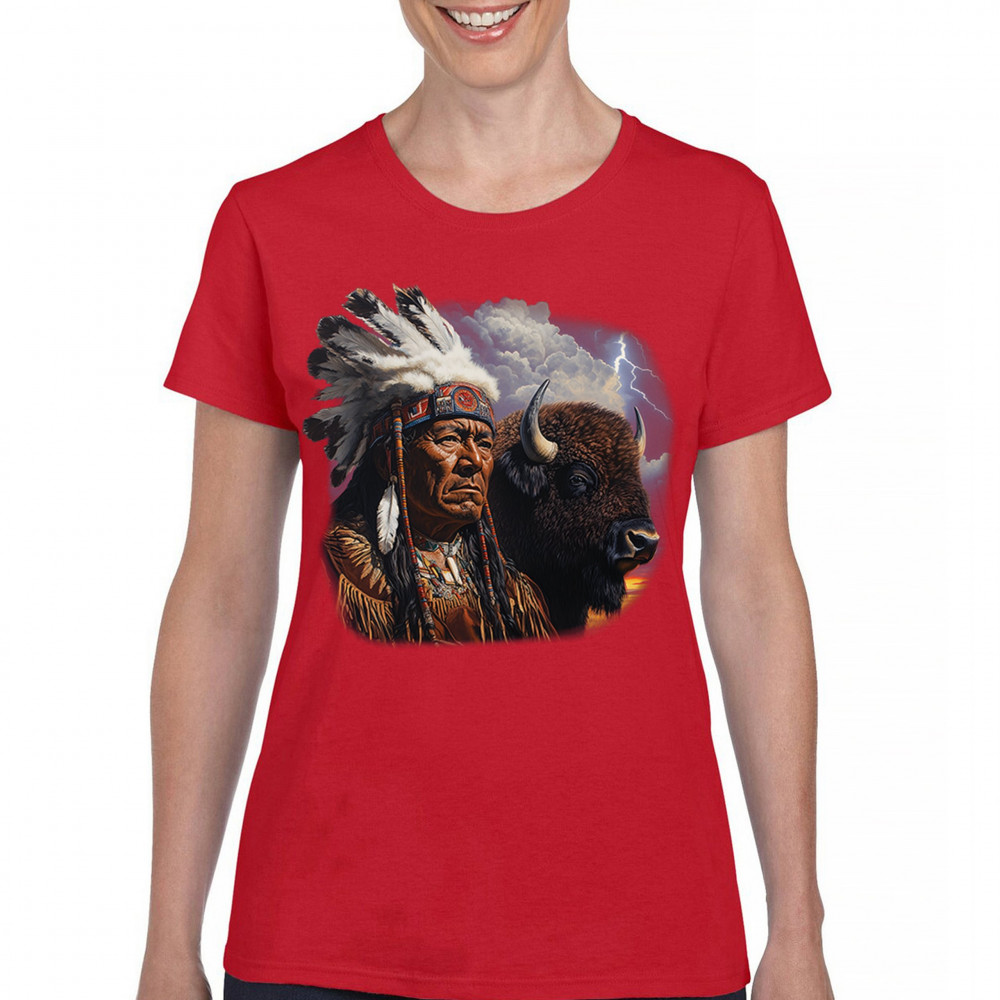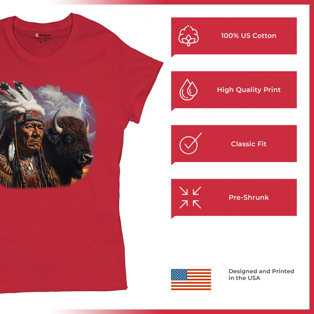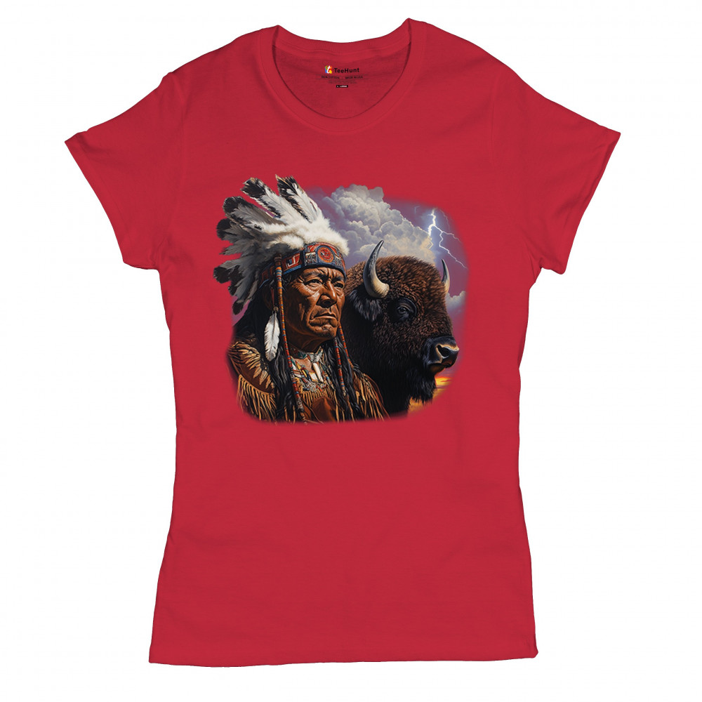 Bold tribal elder and bison design framed by lightning sky—honoring heritage, strength, resilience, and sacred connection to nature.