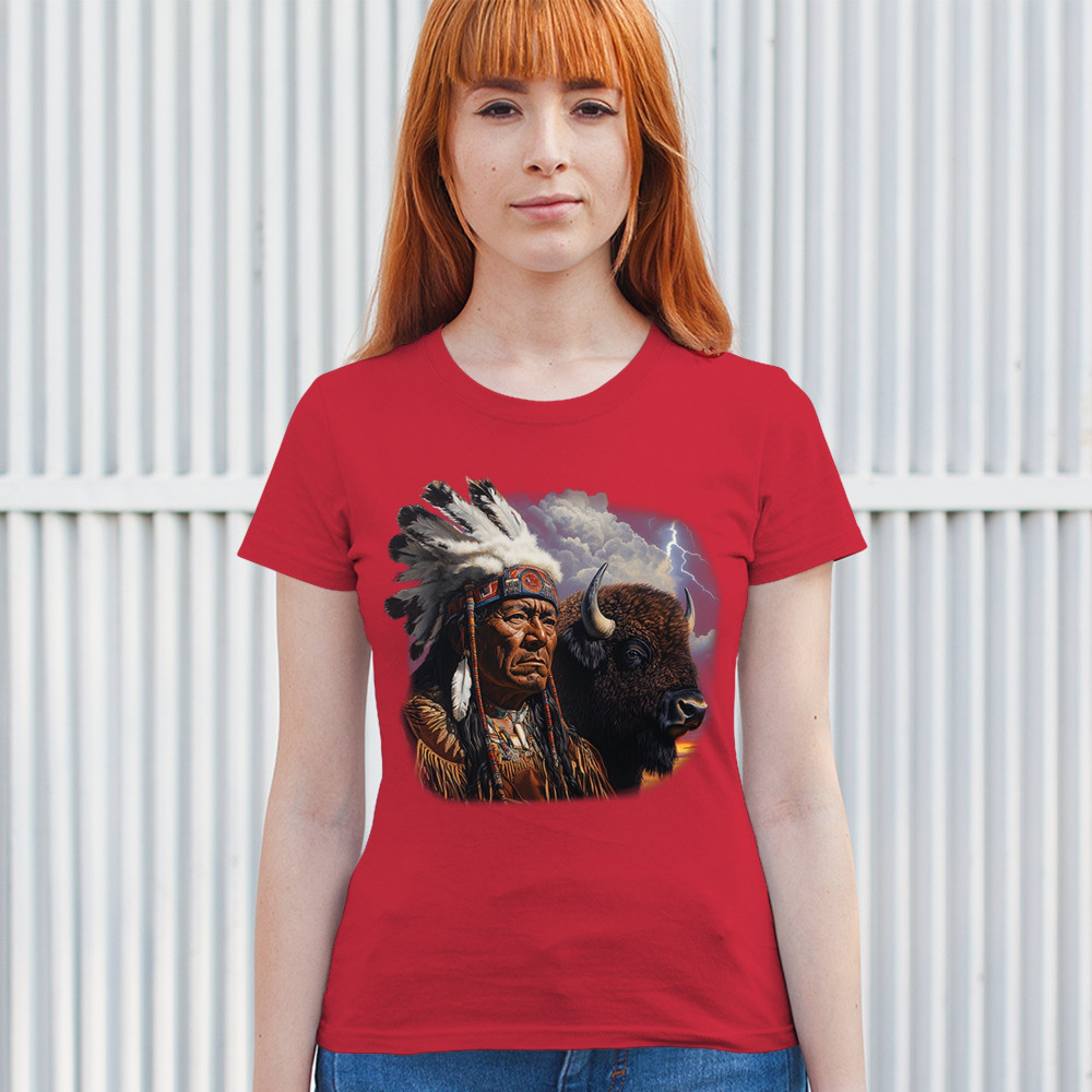 This powerful design features a Native American elder in traditional dress and feathered headdress beside a noble bison. Framed by a stormy sky and lightning, the art symbolizes tribal pride, spiritual harmony, ancestral strength, and a deep connection to nature’s raw energy.