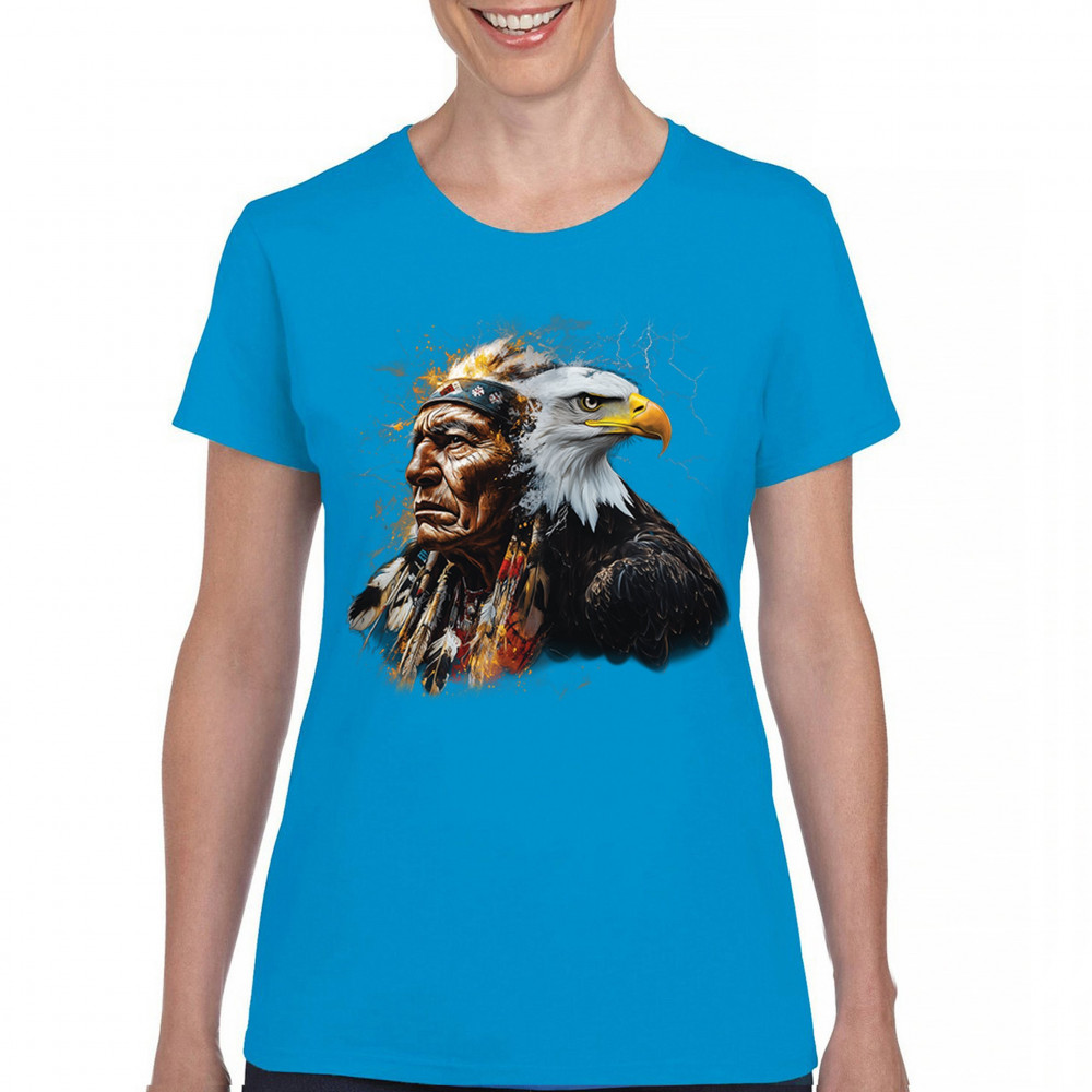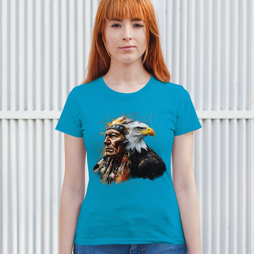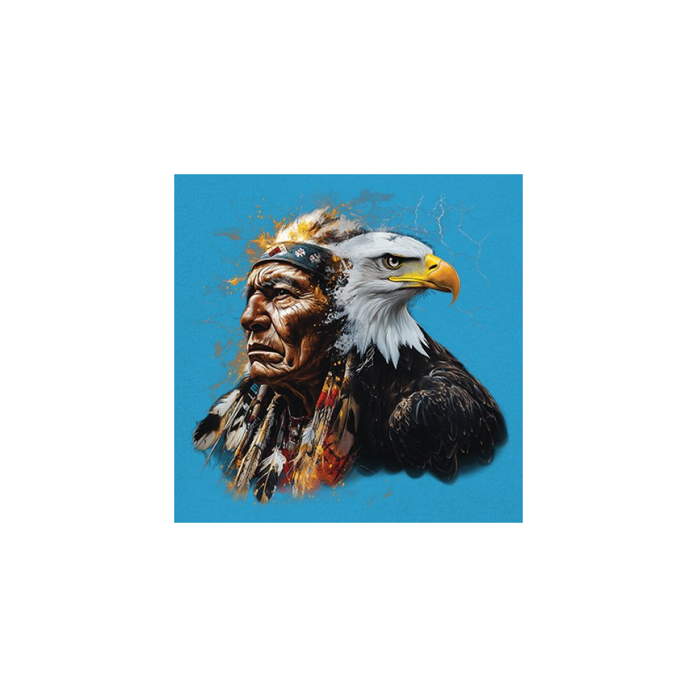 This electrifying design showcases a Native American chief with a bold bald eagle, surrounded by lightning and fire. It blends spiritual animal symbolism with cultural strength and pride. Ideal for admirers of tribal heritage, ancestral energy, and fierce visual storytelling through nature and tradition.