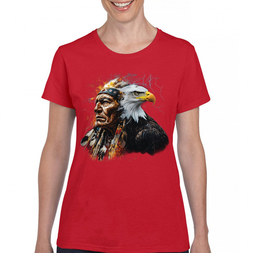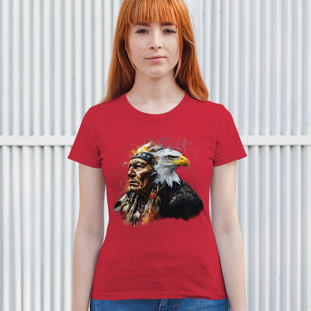 This electrifying design showcases a Native American chief with a bold bald eagle, surrounded by lightning and fire. It blends spiritual animal symbolism with cultural strength and pride. Ideal for admirers of tribal heritage, ancestral energy, and fierce visual storytelling through nature and tradition.
