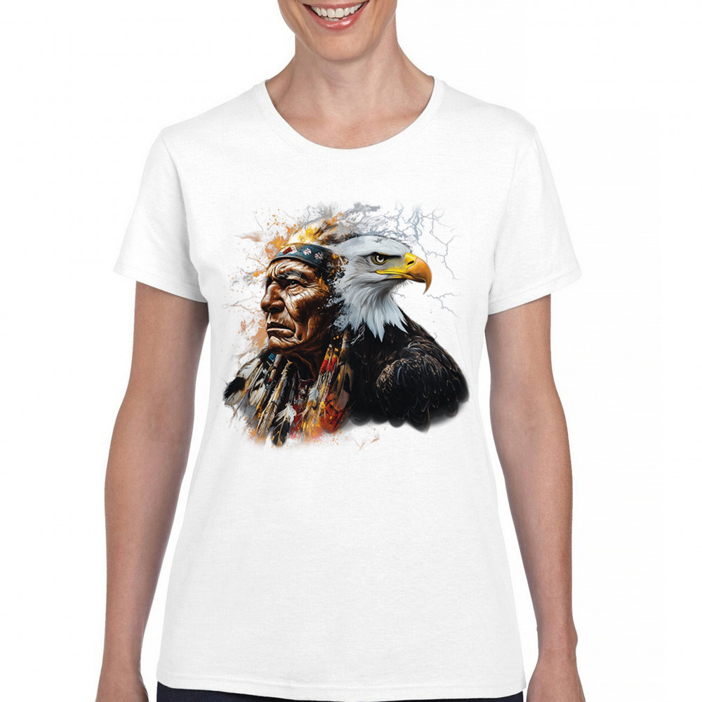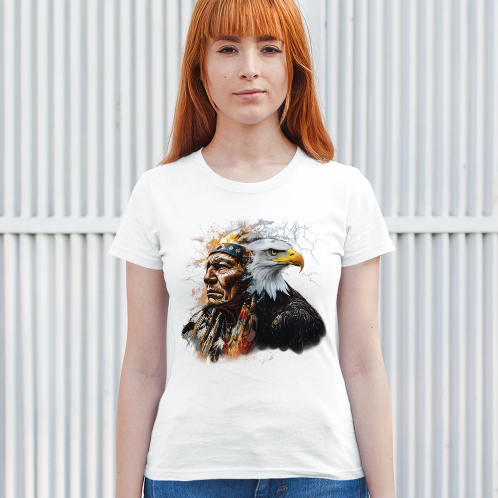 This electrifying design showcases a Native American chief with a bold bald eagle, surrounded by lightning and fire. It blends spiritual animal symbolism with cultural strength and pride. Ideal for admirers of tribal heritage, ancestral energy, and fierce visual storytelling through nature and tradition.