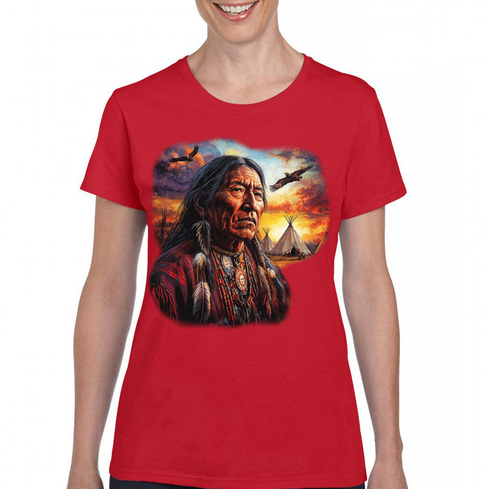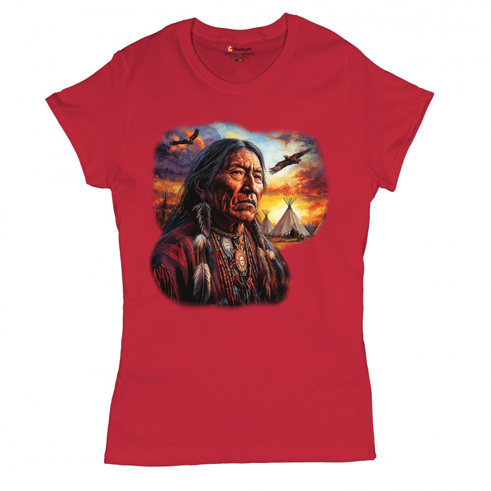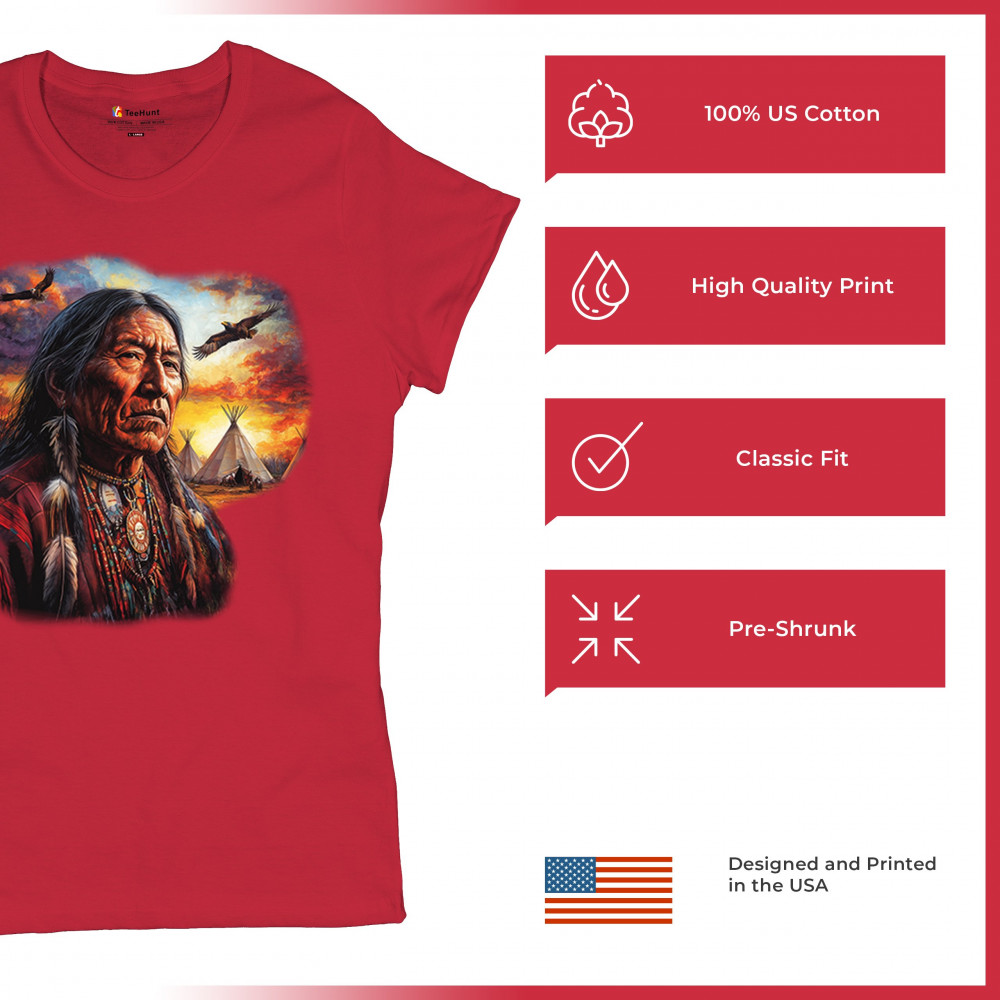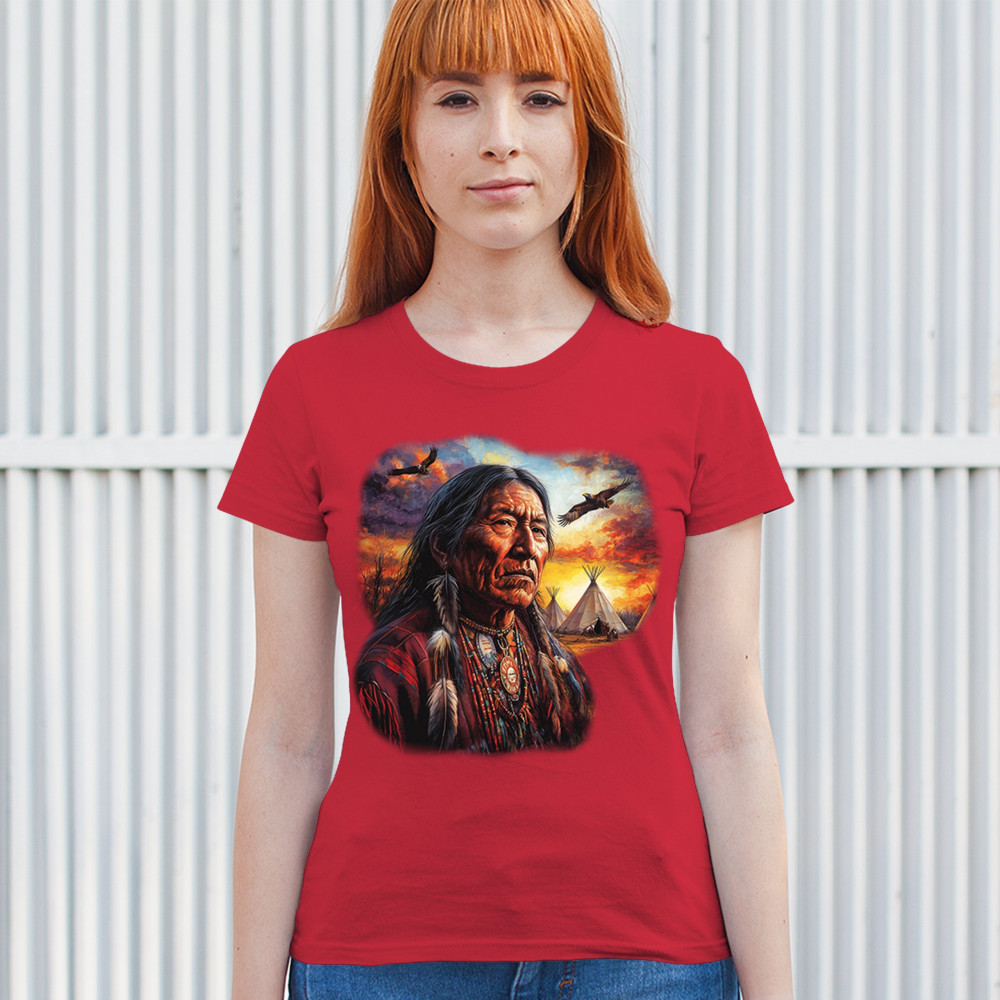 This vivid artwork features a Native American elder in traditional feathered attire, set before a blazing sunset with soaring eagles and peaceful teepees. The scene symbolizes strength, heritage, and spiritual wisdom. A heartfelt tribute to tribal pride, ancestral legacy, and cultural connection to land.