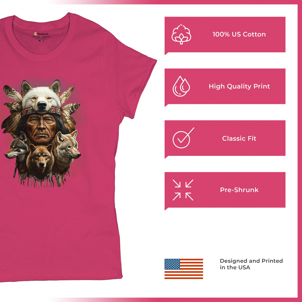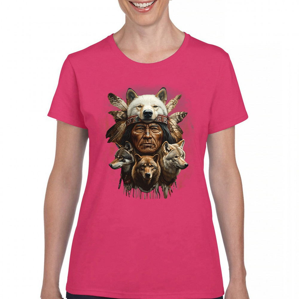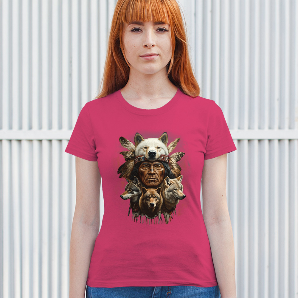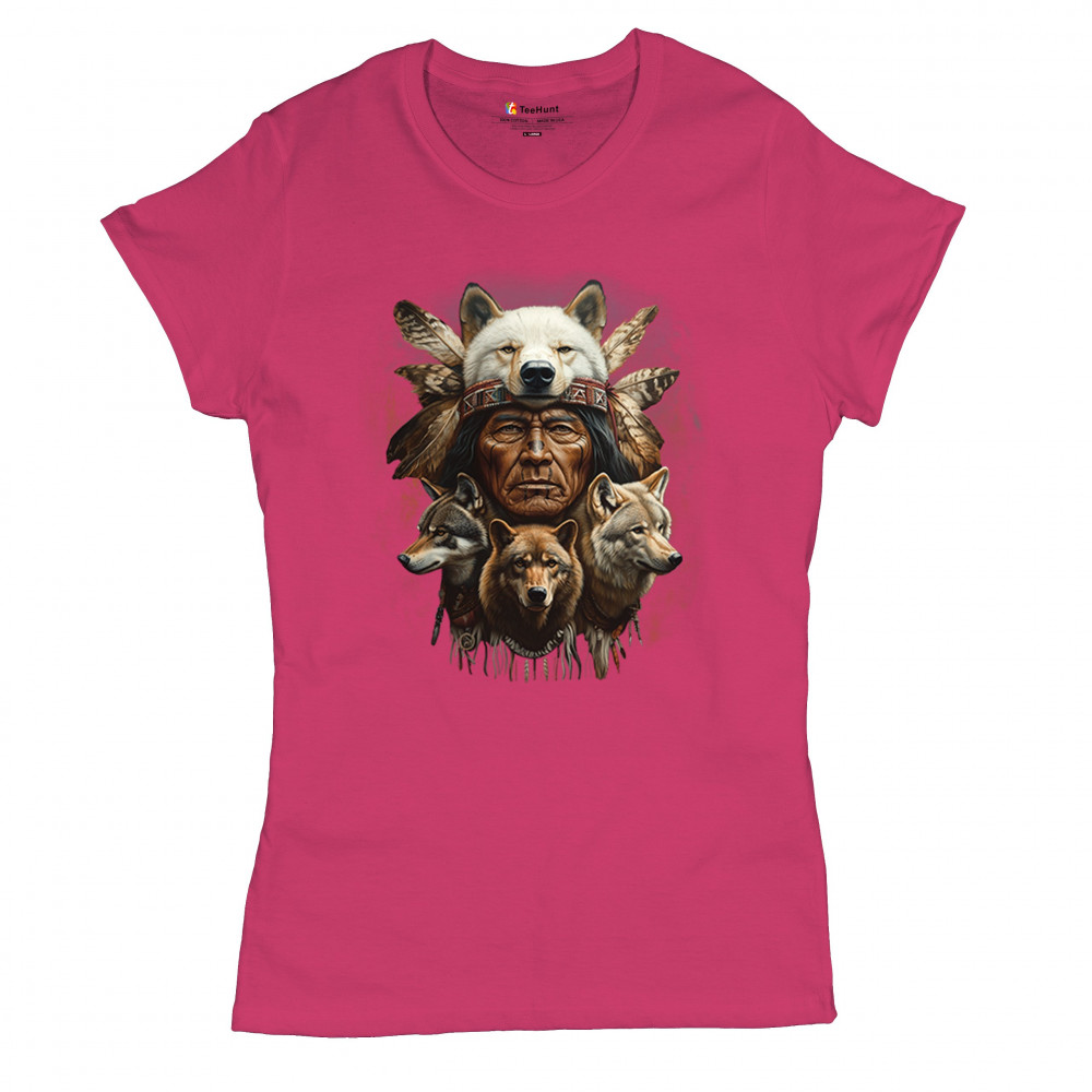 Wolf totem design with Native elder in headdress and guardian wolves. Symbolizes strength, loyalty, spirit animals, and tribal heritage.