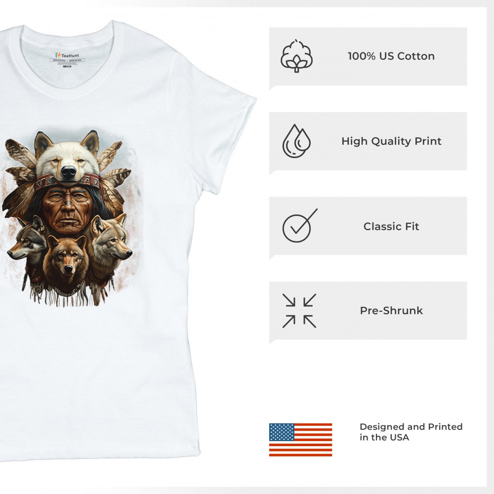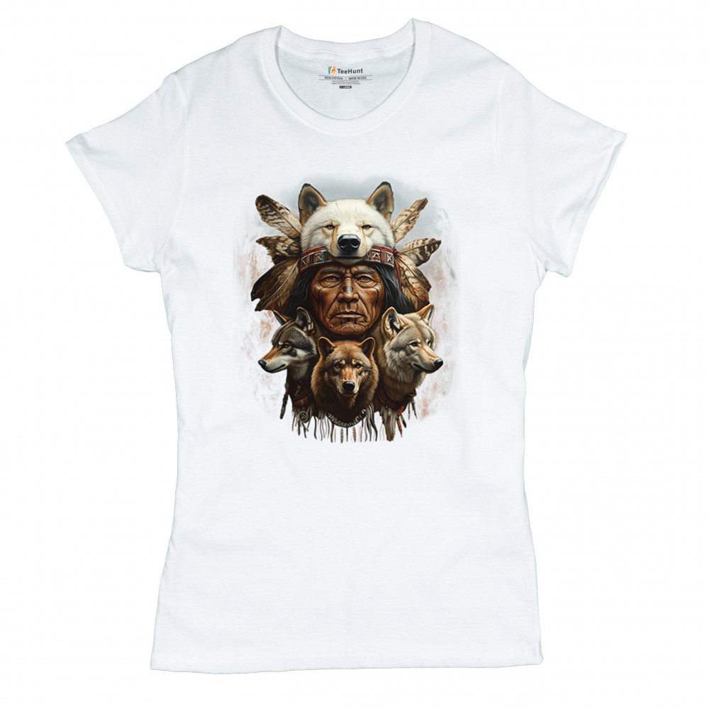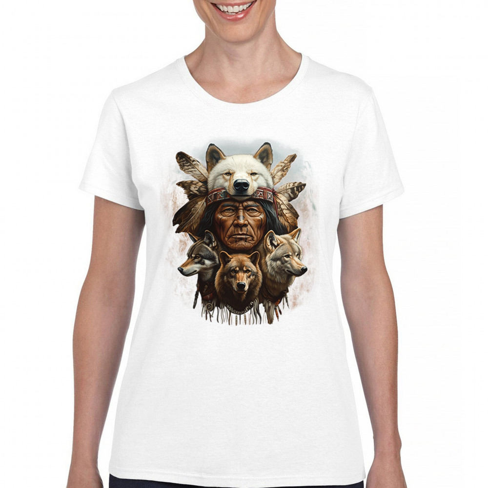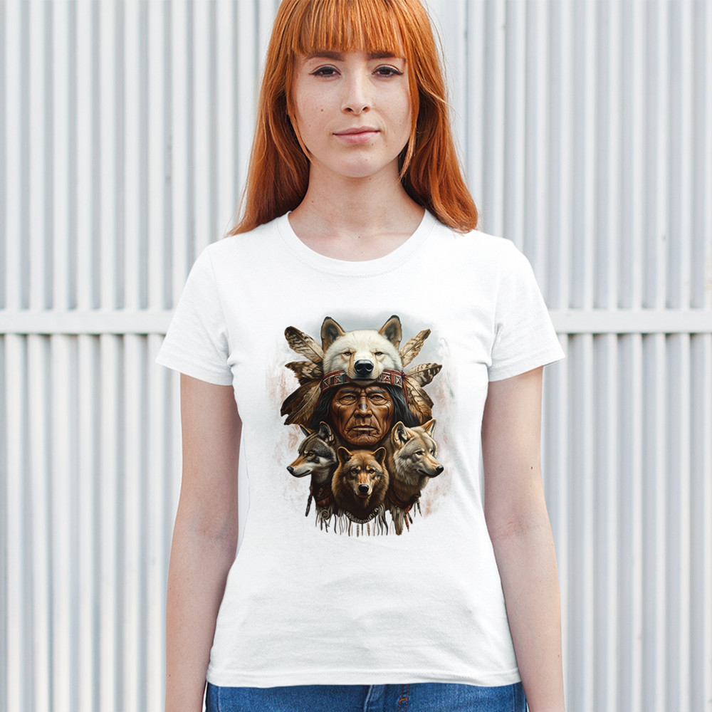 Wolf totem design with Native elder in headdress and guardian wolves. Symbolizes strength, loyalty, spirit animals, and tribal heritage.