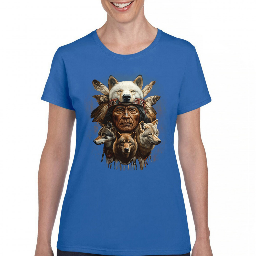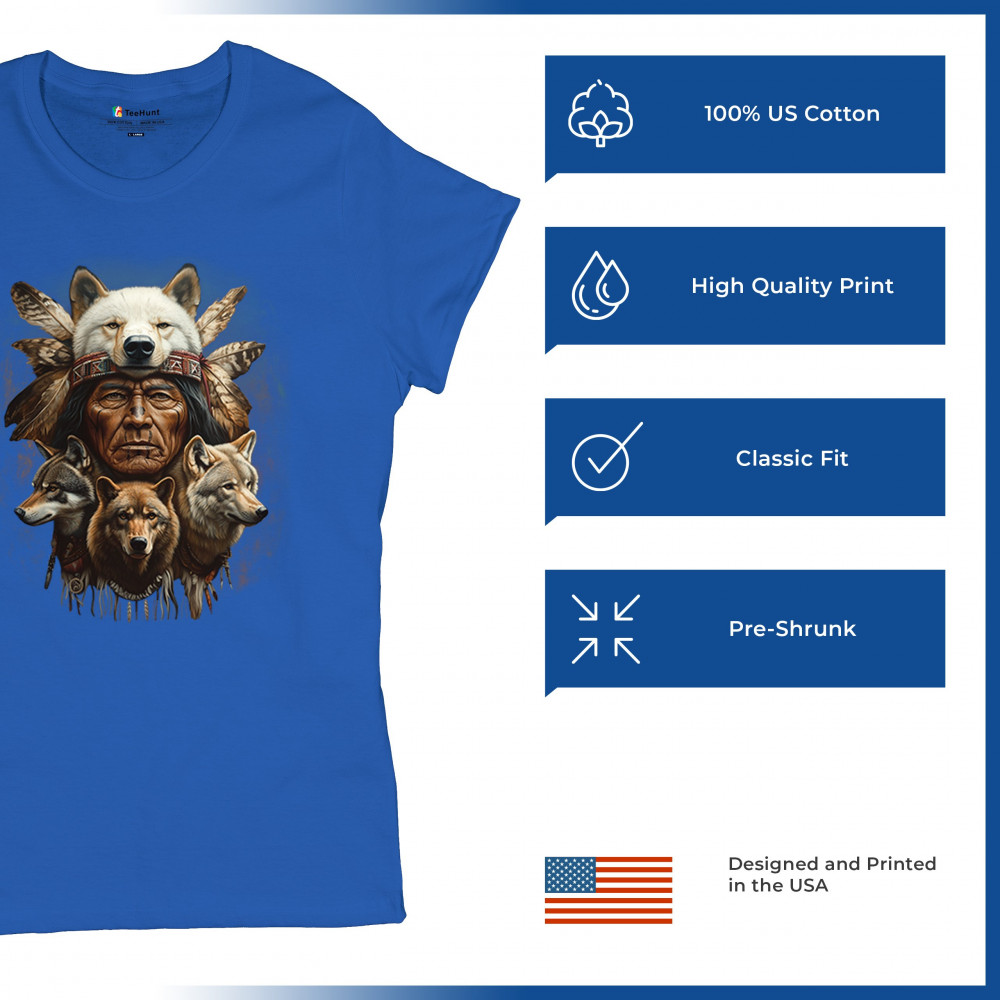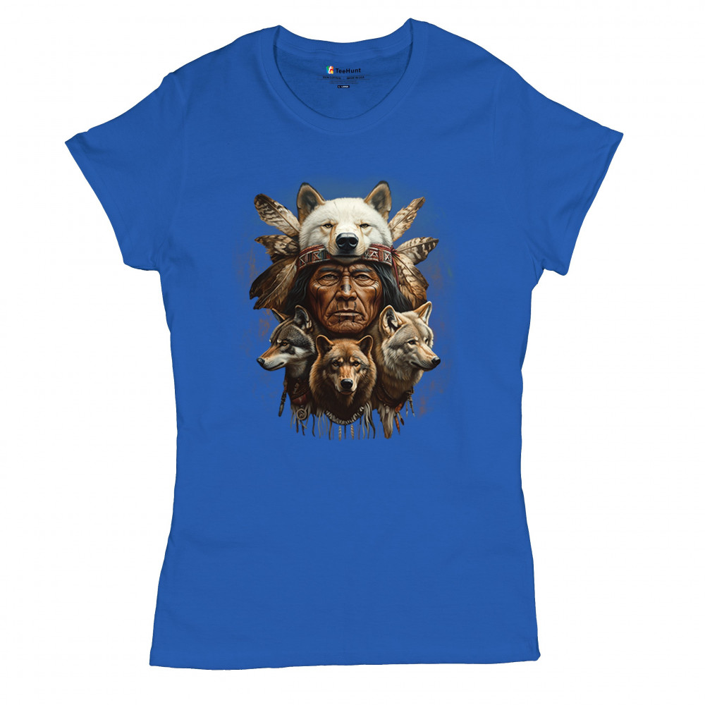 Wolf totem design with Native elder in headdress and guardian wolves. Symbolizes strength, loyalty, spirit animals, and tribal heritage.