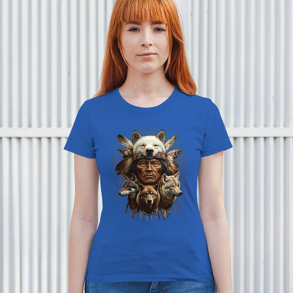 This spiritual tribal design showcases a Native American elder in a detailed wolf headdress surrounded by guardian wolves. It represents strength, loyalty, instinct, and sacred unity with nature. A powerful totem for honoring animal bonds, native pride, and ancestral spiritual guidance through the spirit of the wolf.