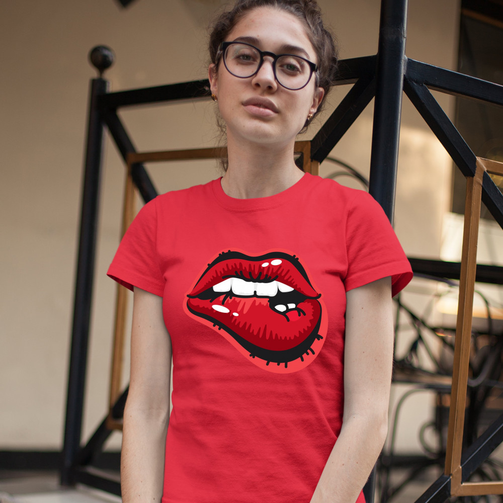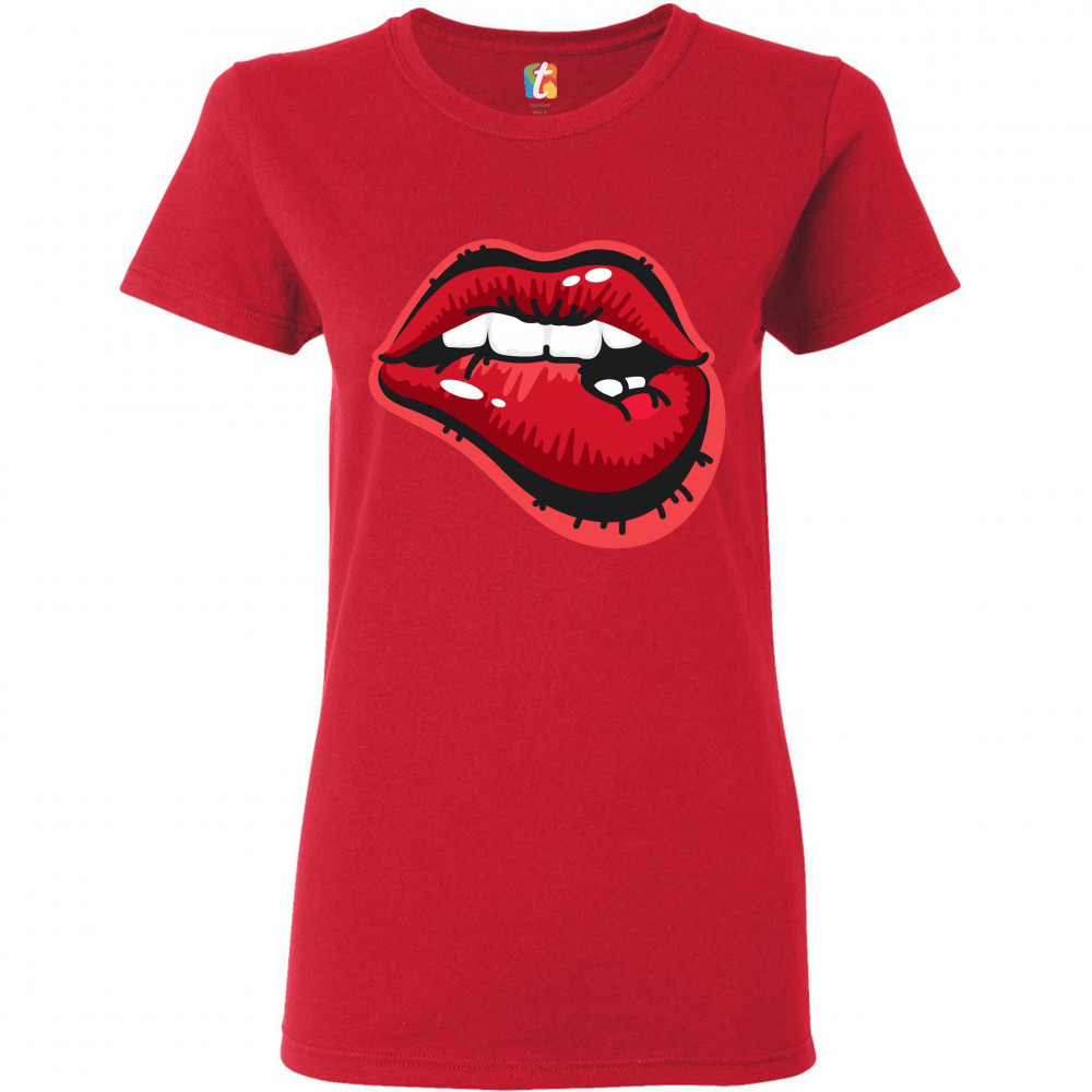 NAUGHTY BITING LIPS t-shrit hot luscious sexy red lips women's tee red
