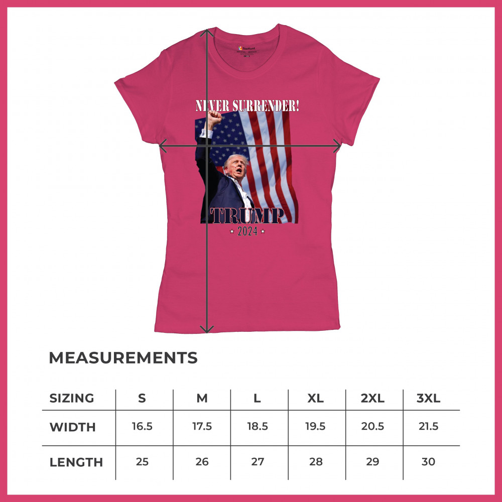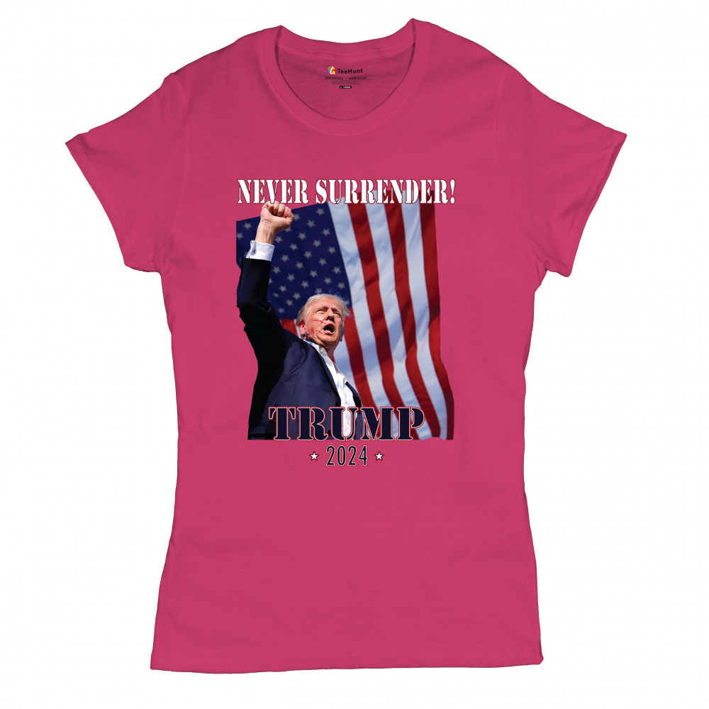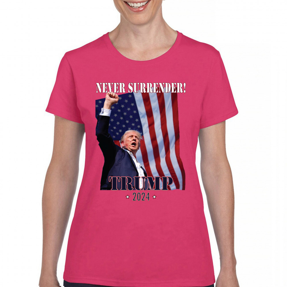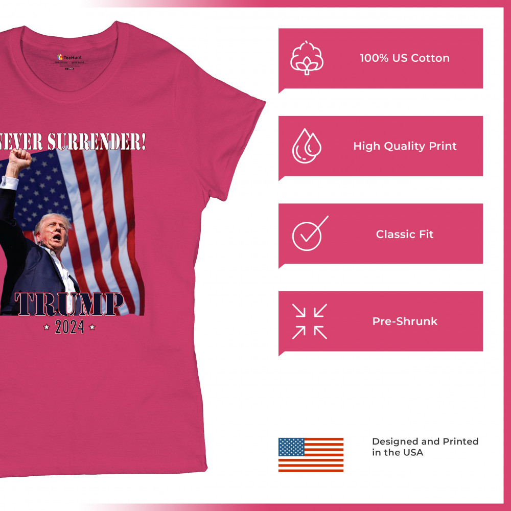 Support Donald Trump with our bold "Never Surrender! Trump 2024" design, featuring Trump against the American flag. Perfect for rallies and everyday wear.