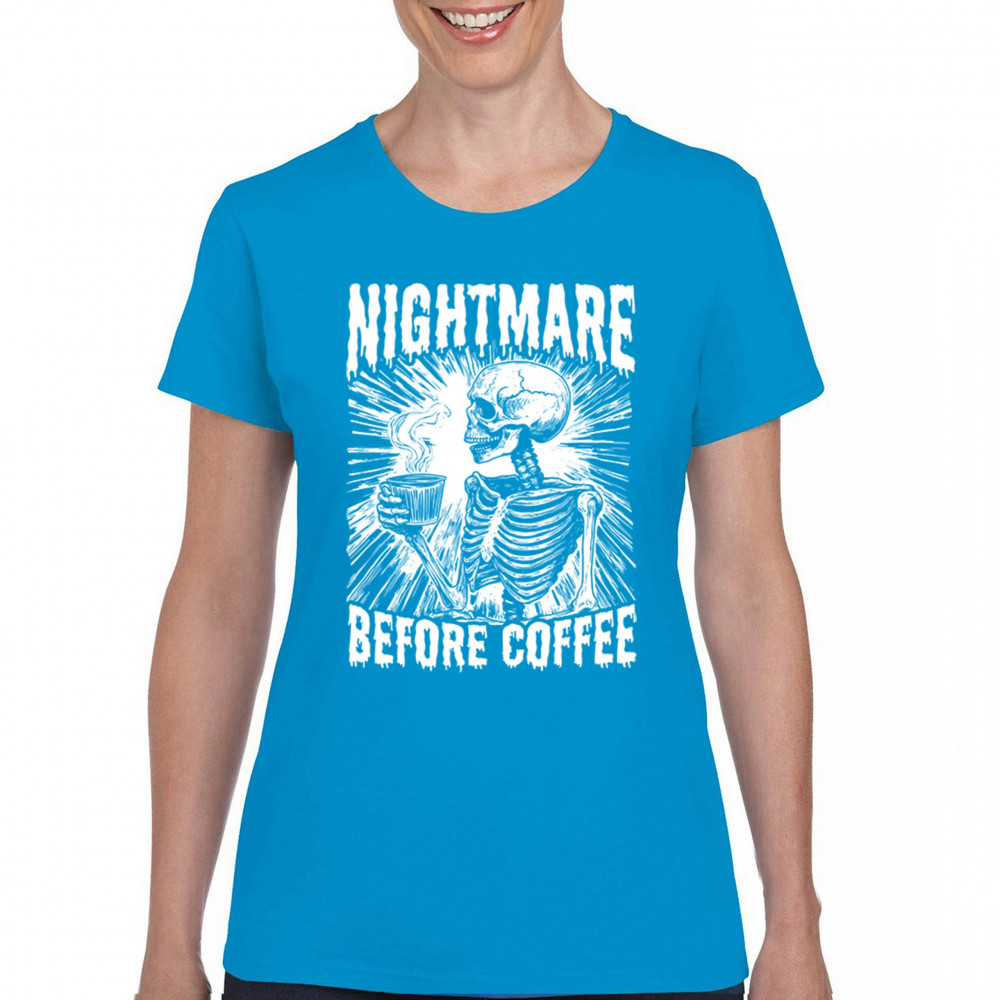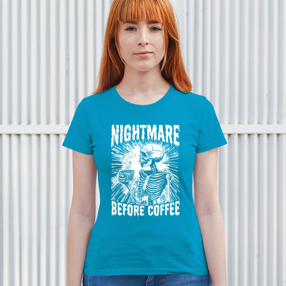Show off your love for coffee with this quirky "Nightmare Before Coffee" skeleton design, blending humor and gothic style for caffeine lovers.